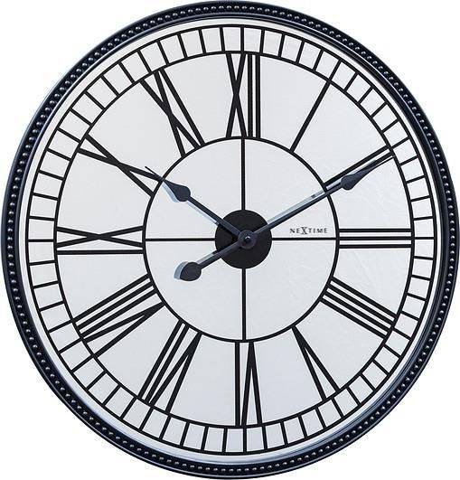 NeXtime "Cleopatra Mirror" to duży okrągły zegar ścienny (ø 56 cm) Zegar lustrzany ma czarną plastikową obudowę, nadrukowany czarny wskaźnik rzymskiego i romantyczne wskazówki w stylu Zegar jest cichy działa na 1 x baterię AA (nie dołączona)