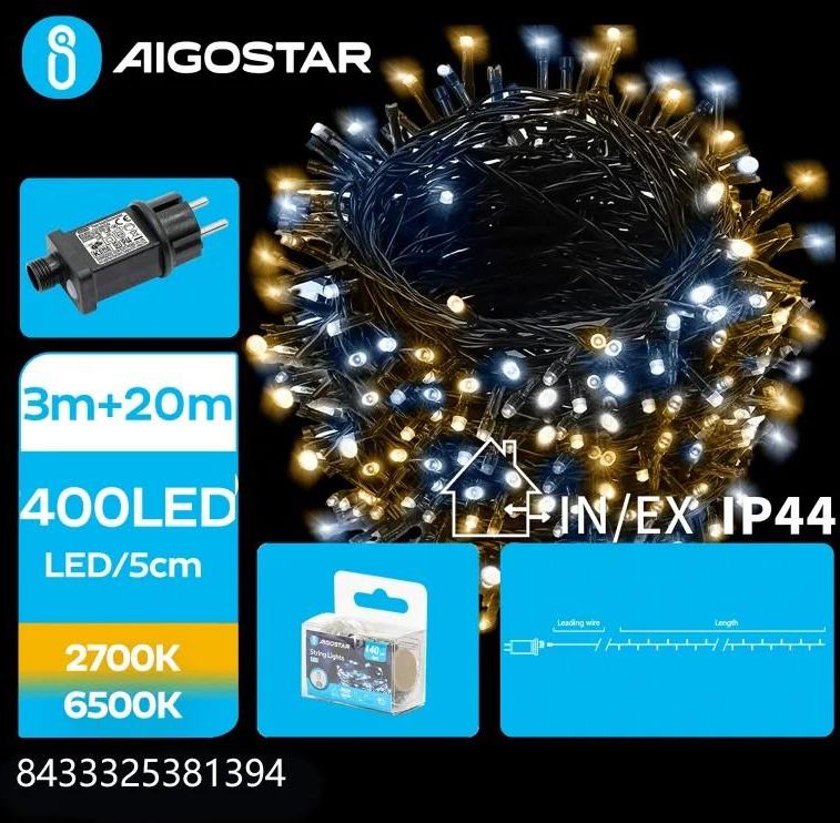 Niskonapięciowe lampki choinkowe zewnętrzne 400led Ciepła z Zimną 20m Aigostar Niskonapi­ęciowe lampki choinkowe zewnętrzne 400LED Ciepła z Zimną 20m Profesjonalne oświetlenie świąteczne dla Twojego domu i ogrodu. Te wyjątkowe lampki choinkowe łączą ciepłe i zimne światło, tworząc magiczną atmosferę podczas świąt Bożego Narodzenia. Kluczowe cechy produktu • 400 diod LED rozmieszczonych co 5cm na 20-metrowym przewodzie • Podwójny kolor światła - ciepłe i zimne LED w jednym zestawie • 8 funkcji świetlnych z pamięcią ustawień i timerem • Energooszczędność - maksymalna moc tylko 6W przy napięciu 220-240V • Klasa wodoodporności IP44 - idealne do użytku zewnętrznego • Wytrzymałe materiały - plastik i miedź gwarantują długotrwałe użytkowanie Ciemnozielony przewód doskonale wtapia się w naturalne otoczenie, podczas gdy czarny adapter pozostaje dyskretny. Lampki sprawdzą się idealnie dla właścicieli domów planujących świąteczne dekoracje, organizatorów wydarzeń szukających profesjonalnego oświetlenia, oraz firm chcących stworzyć świąteczny nastrój. Łatwa instalacja bez konieczności pomocy specjalisty. Funkcja pamięci zapamięta Twoje ulubione ustawienia, a timer automatycznie włączy oświetlenie o wybranej porze. Specjalne efekty świetlne pozwalają dostosować atmosferę do każdej okazji. Dzięki wysokiej trwałości i odporności na warunki atmosferyczne, te lampki będą służyć przez wiele sezonów świątecznych, zapewniając niezawodne i spektakularne oświetlenie Twojego domu. Opis punktów sprzedaży: 400LED. 5 cm/LED. 8 zmieniających się trybów + pamięć + timer