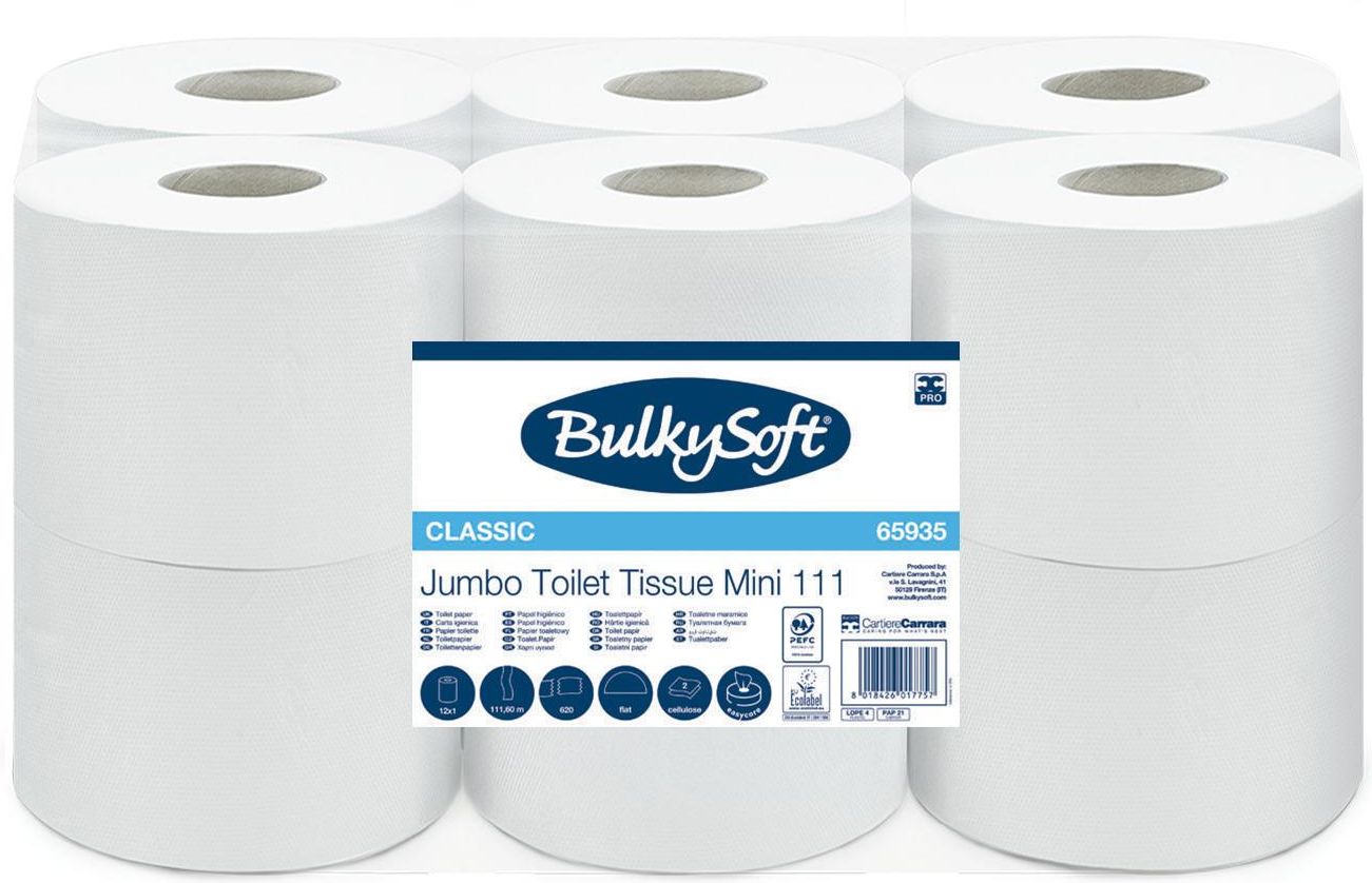 Papier toaletowy centralnego dozowania Mini BulkySoft, 2 warstwy, kolor biały, celuloza, długość roli 111,60m. 12 rolek/op Numer artykułu: 65935 Papier toaletowy centralnego dozowania Mini Kolor: Biały Surowiec: Celuloza Ilość warstw: 2 Ilość listków: 620 Długość rolki: 111,60 m Ilość rolek w kartonie: 12 Papier dwuwarstwowy, gładki, wykonany z selekcjonownej czystej celulozy. Systemowy papier toaletowy - dozowanie po jednym listku - oszczędność zużycia nawet do 40% w porówaniu z tradycyjnym papierem toaletowym typy jumbo. Papier dedykowany do miejsc o dużym natężeniu ruchu tj. szkoły, galerie handlowe, zakłady przemysłowe itd. Papier szybko rozpuszcza się w wodzie.