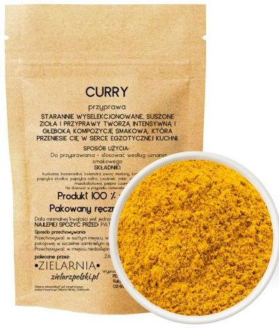 CURRYprzyprawa Starannie wyselekcjonowane, suszone zioła i przyprawy tworzą intensywną i głęboką kompozycję smakową, która przeniesie Cię w serce egzotycznej kuchni.Sposób użycia: Do przyprawiania - stosować według uznania smakowegoSkładniki:kurkuma, kozieradka, kolendra owoc mielony, kmin rzymski mielony, papryka słodka, papryka ostra, czosnek, imbir, cynamon, goździki, gałka muszkatołowa, pieprz czarny, chilli Sposób przechowywania: Przechowywać w suchym miejscu, w temperaturze pokojowej w szczelnie zamkniętym opakowaniu. Przechowywać w miejscu niedostępnym dla małych dzieci.Produkt 100 % naturalny. Pakowany ręcznie w Polsce. polecane przez: Zielarnia zielarzpolski.pl® jest zarejstrowanym znakiem towarowym Zielarnia Mikołaj OłdakowskiZAWARTOŚĆ NETTO: 50 GWyprodukowano w Polsce dla: PERSEA SP. Z O.O. Rakowiecką 5/37, 02-517 Warszawa