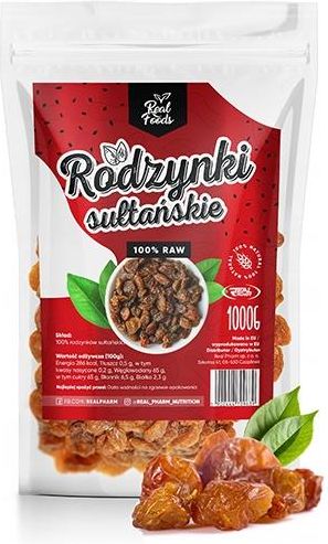 Real Foods - Rodzynki Sułtańskie 1000g Rodzynki sułtańskie to naturalna i słodka przekąska powstająca z suszonych winogron. Są jedną z najchętniej wybieranych bakalii zarówno przez dzieci, jak i dorosłych. W porównaniu do przetworzonych słodyczy zawierają mniej kalorii, a jednocześnie dostarczają cennych witamin, minerałów i błonnika. Mogą być spożywane samodzielnie lub jako dodatek do ciast, deserów, musli i sałatek. Dlaczego warto? Naturalna słodka przekąska Źródło witamin i minerałów Wysoka zawartość błonnika Bez dodatku cukru – zawiera tylko naturalnie występujące cukry Wygodne opakowanie: 1 kg Kraj pochodzenia: różne kraje w zależności od partii (najczęściej Turcja, Iran, Grecja) Dla kogo? Rodzynki Real Foods to świetny wybór dla osób poszukujących zdrowej alternatywy dla słodyczy. Sprawdzą się zarówno jako szybka przekąska w ciągu dnia, jak i składnik zdrowych wypieków czy śniadań. Wartości odżywcze na 100 g Składnik Ilość Wartość energetyczna 1215 kJ / 287 kcal Tłuszcze 0,5 g — w tym kwasy tłuszczowe nasycone 0,2 g Węglowodany 65 g — w tym cukry 65 g Błonnik 6,5 g Białko 2,3 g Sól 0,05 g Skład: Rodzynki sułtanki, olej słonecznikowy. Sposób użycia: Rodzynki można jeść bezpośrednio jako przekąskę lub dodawać do deserów, ciast, owsianki, musli i sałatek. Uwagi: Rodzynki są naturalnie bogate w cukry, dlatego warto spożywać je z umiarem. Produkt należy przechowywać w suchym i chłodnym miejscu, z dala od dzieci.