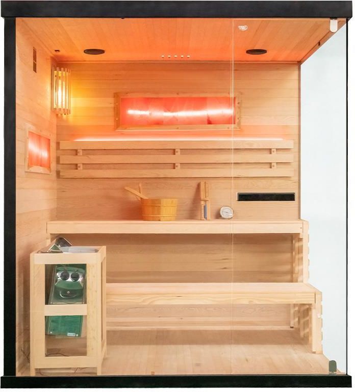 SAUNA FIŃSKA LARK5 tradycyjna zwana również jako sauna sucha to propozycja stworzenia strefy komfortu dla siebie i bliskiej nam osoby we własnym domu. Wybierając saunę fińską firmy HYDROSAN stawiamy na zdrowie, relaks oraz komfort. Sauna LARK5 wyposażona została w dwa duże panele solne, które wzbogacają powietrze w cenne mikroelementy. Wykonana jest z dobrej jakości drewna, jodły kanadyjskiej HEMLOCK, która wyróżnia się trwałością i odpornością na deformację oraz zapewnia właściwości izolacyjne. Wysoka temperatura powietrza jaka powstaje w saunie od 60 do 85 stopni Celsjusza przy wilgotności w granicach 5-15% osiągana jest dzięki specjalnemu piecowi HARVIA VEGA, który rozgrzewa generujące ciepło kamienie. Ta tradycyjna sauna rozgrzewa się od 30 do 60 minut i działa na nasz organizm wilgotnym, gorącym powietrzem. Wytworzone ciepło sprawia że nasz organizm się regeneruje, mobilizuje do poprawy mikrokrążenia, lepszego utlenowania oraz dużego pocenia. Korzystanie z tradycyjnej sauny przynosi wiele korzyści dla naszego samopoczucia i zdrowia, 1-2 razy w tygodniu to odpowiednia ilość uczestniczenia w terapeutycznych seansach. Sauna pomaga wzmocnić odporność, złagodzić przewlekłe bóle mięśniowe oraz poprawia wydolność krążenia, sprzyja przystosowaniu naszego organizm do zmian temperatury. Jest idealnym sposobem na oczyszczenie organizmu z toksyn, co bezpośrednio wpływa nie tylko na zdrowie, ale również urodę Oprócz korzyści dla ciała, sauna fińska tradycyjna ma również pozytywny wpływ na nasz umysł. Relaksujący i kojący klimat pozwala nam oderwać się od codziennego stresu i napięcia, terapeutyczna moc oraz relaksacyjny charakter sprawiają, że jest to jedno z najpopularniejszych i najbardziej cenionych miejsc w kulturze fińskiej i na świecie. LARK5 SAUNA 4-5 OSOBOWA Z PANELAMI SOLNYMI I FUNKCJĄ BLUETOOH DOMOWA STREFA KOMFORTU DANE TECHNICZNE sauna: fińska tradycyjna, rodzaj: sucha, wymiary: szer.160 cm x dł.180 cm x 200 cm, wysokość: 200 cm, sauna: 4-5 osobowa, prostokątna, materiał: drewno - jodła kanadyjska HEMLOCK, kolor drewna: naturalny w środku, na zewnątrz czarny, grubość ścianek: 55 mm, drzwi pojedyncze otwierane, szkło: transparentne - hartowane, grubość szkła: 8 mm, wymiary szyb: szyba drzwiowa 1829x590x8mm, mała szyba 1890x1120x8mm, duża szyba 1890x1520x8mm, piec: HARVIA VEGA BC60, wymiary pieca: szer.480 mm x gł.310 mm x wys.540 mm, łączna moc : 6000W (6KW), zasilanie: 380V/50Hz, czas rozgrzewania sauny: od 30 do 60 minut, posiada 2 duże lamy/panele solne (8 cegiełek), oświetlenie LED: fabrycznie zamontowane 7 kolorów do chromoterapi, oświetlenie : 1 lampa narożna, zamieszczona na ściance, moduł Bluetooth z 2 głośnikami: umożliwia łatwe połączenie z dowolnym urządzeniem mobilnym, łatwy montaż, GWARANCJA 2 lata. WYPOSAŻENIE drzwi szklane hartowane o grubości szyby 8mm, odporne na uderzenia oraz wysokie temperatury, piec HARVIA VEGA BC60 o mocy 6000W (6KW) z kamieniami, wykonany ze stali nierdzewnej, posiada wbudowany łatwy w obsłudze panel sterujący, pokrętła sterujące temperaturą i czasem pracy, siedziska wykonane z drewna, jodły kanadyjskiej HEMLOCK, która wyróżnia się trwałością i odpornością na deformację oraz zapewnia właściwości izolacyjne, lampy solne : 2 panele solne po 8 cegiełek, wzbogacają powietrze w cenne mikroelementy, działają leczniczo na drogi oddechowe i skórę oraz nadają niepowtarzalnego klimatu, koloroterapia / chromoterapia: listwa LED - oświetlenie 7 kolorami, wspiera regenerację organizmu i uczestniczy w procesie wyciszenia. pilot do regulacji jasności, ustawienia cyklu świetlnego kolorami umieszczonych w oparciu, oświetlenie wewnętrzne: 1 lampa montowana na ściance, doświetli nam wnętrze sauny, ceber z chochlą na wodę do zraszania kamieni, Wylana na rozgrzane kamienie niewielka ilość wody daje obfity kłąb pary, która staje się nośnikiem ciepła. Dzięki temu ciepło zostaje rozprowadzone po całym wnętrzu kabiny higrometr do pomiaru wilgotności, urządzenie, dzięki któremu z precyzją i wysoką dokładnością można określić poziom nawilżenia powietrza, czyli zawartość pary wodnej w powietrzu klepsydra do odmierzania czasu seansu w saunie, daje gwarancję, że czas spędzony w saunie był odpowiedni dla zdrowia oraz samopoczucia. Pozwala ona na wygodne kontrolowanie, ile czasu pozostało do końca seansu kratka wentylacyjna w suficie, jest istotnym elementem wyposażenia, odpowiednia wentylacja zapewnia dopływ świeżego powietrza a także odprowadzanie zużytego – ciepłego i wilgotnego wbudowany moduł Bluetooth z głośnikami: umożliwia łatwe połączenie z dowolnym urządzeniem mobilnym aby w pełni cieszyć z korzystania sauny po włączeniu w telefonie funkcji Bluetooth należy wyszukać i połączyć się z urządzeniem ,,ZZ-100" ZALETY KORZYSTANIA Z SAUNY FIŃSKIEJ Sauna fińska wykazuje wszechstronny wpływ na zdrowie i samopoczucie człowieka stosowana jako metoda oczyszczenia i relaksu. Doceniana przez osoby zapracowane, które szukają odprężenia, borykające się z napięciem nerwowym i mięśniowym, a także sportowcy - w celu regeneracji i szybkiego powrotu do zdrowia. Jej największą zaletą, jest to, że rewelacyjnie działa na układ nerwowy, odprężając i wyciszając a działanie wysokiej temperatury na organizm wpływa na obniżenie ciśnienia krwi, zwiększenie czynności serca oraz pomaga pozbycie się toksyn z ciała. RELAKS I REDUKCJA STRESU: Wysoka temperatura jaka panująca w saunie sprawia, że mięśnie się rozluźniają, co przekłada się na ogólne odprężenie organizmu, ma również pozytywny wpływ na nasze samopoczucie, przynosząc uczucie relaksu i redukując napięcie spowodowane stresem. OCZYSZCZANIE Z TOKSYN: Działania gorącego powietrza wytworzonego w saunie powoduje pocenie się co sprzyja usuwaniu zanieczyszczenia i toksyn oraz poma