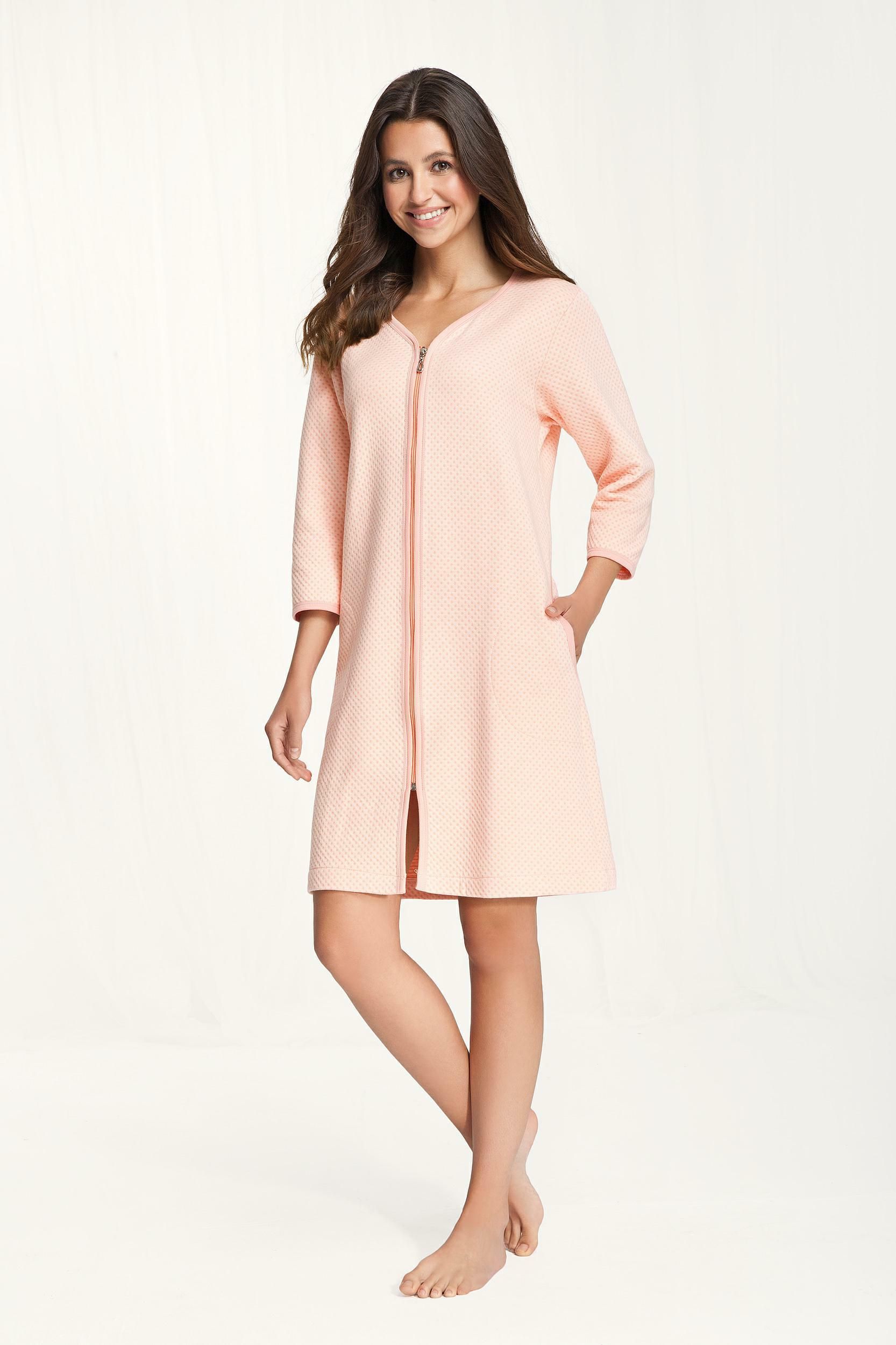 Szlafrok damski bawełniany M 214 morelowy podomka na suwak firmy LUNA . Rozmiar: M Tkanina: 100% bawełna Płeć: dla Pań . Przepis prania temperatura prania 40°C nie wybielać nie czyścić chemicznie nie chlorować temperatura prasowania 110°C