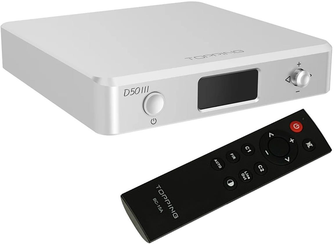 Przetwornik cyfrowo-analogowy DAC Hi-Res z Bluetooth 5.1 Topping D50 III - Srebrny Wysokiej jakości nowoczesny przetwornik cyfrowo-analogowy (DAC) od Topping z dołączonym pilotem Bluetooth 2.4G, który doskonale spełni oczekiwania miłośników dźwięku Hi-Fi, poszukujących precyzji i naturalności …