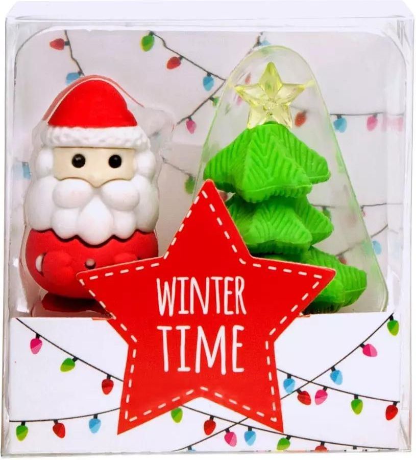 Zestaw gumek do ścierania zawiera Mikołaja i choinkę. Wymiary zestawu wraz z opakowaniem: 6,1 cm x 3,0 cm x 6,5 cm
