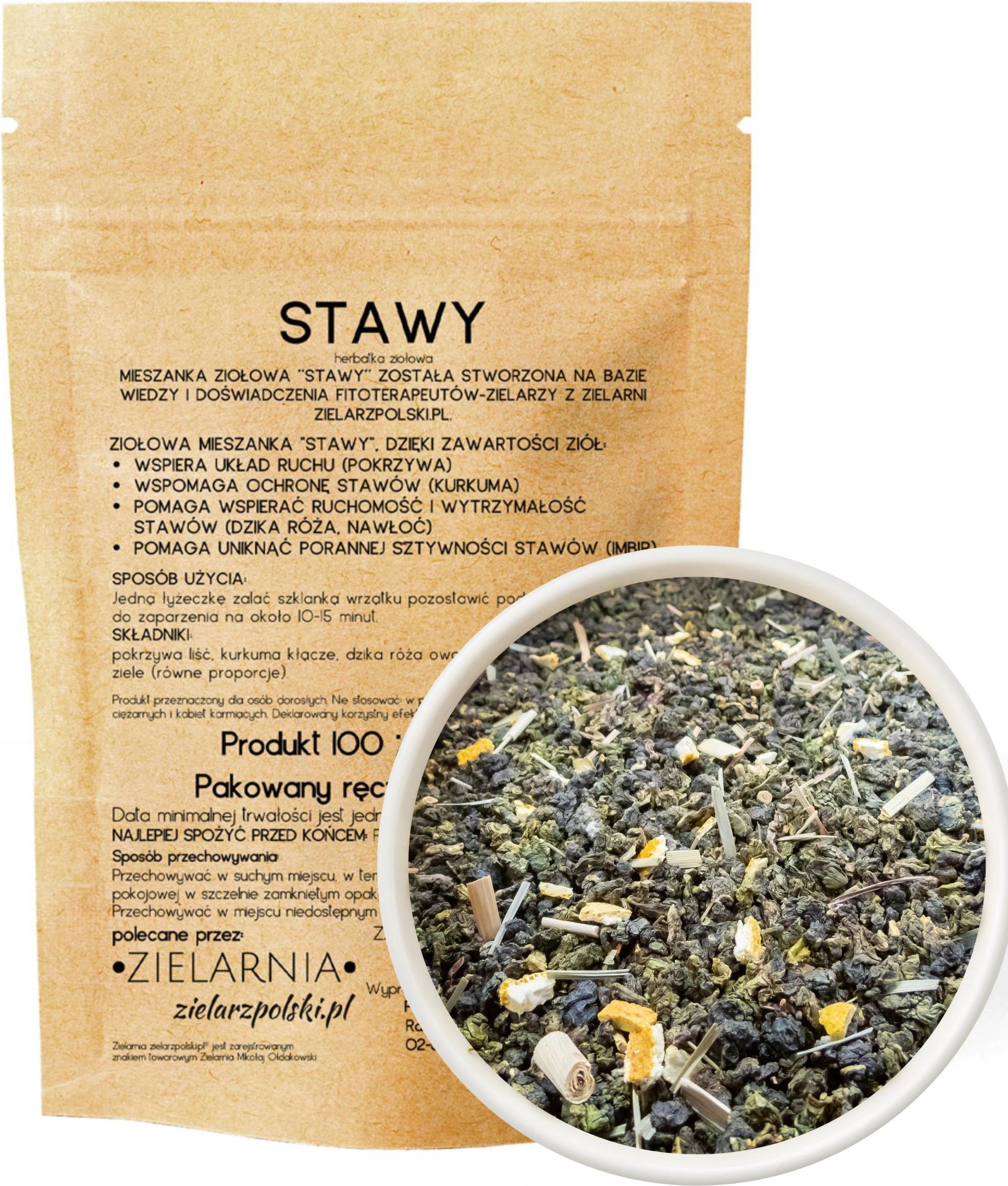 STAWY herbatka ziołowa 100g Mieszanka ziołowa STAWY została stworzona na bazie wiedzy i doświadczenia fitoterapeutów - zielarzy z Zielarnia zielarzpolski Ziołowa mieszanka "STAWY", dzięki zawartości ziół: wspiera układ ruchu (pokrzywa) wspomaga ochronę stawów (kurkuma) pomaga wspierać ruchomość i …