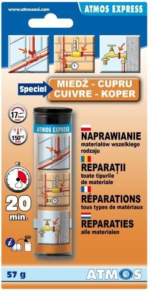 Klej uniwersalny, wyróżniający się miedzianym kolorem. Ze względu na barwę świetnie nadaje się do napraw armatury i rur miedzianych. Preparat przyda się także do innych reperacji w domu i w samochodzie. Klej spaja z łatwością różne materiały, na przykład szkło, drewno i tworzywa sztuczne. Charakteryzuje się także krótkim czasem spojenia.naprawianie wszelkiego rodzaju materiałówmocuje wszystkie rodzaje materiałówidealny do miedziParametry logistyczneDługość opakowania: 3 cmWaga brutto: 0.078 kgSzerokość opakowania: 10.5 cmWysokość opakowania: 20 cmParametry techniczne i użytkoweMetoda aplikacji: rozgrzać masę w rękach, następnie nałożyć i pozostawić do wyschnięciaCzas do pełnego utwardzenia: 1 hTemperatura aplikacji: temperatura otoczeniaCzas wiązania: 10 minutObszary zastosowania: do łączenia (spawania na zimno), naprawy oraz montażu wszelkich materiałówParametry indywidualneGwarancja: obowiązuje rękojmiaOkres przechowywania: 12 miesięcy od daty produkcjiInformacje dodatkowe: do różnych zastosowań: instalacji hydraulicznych (miedzi, stali, żelaza, metalu galwanizowanego)Marka: AtmosEAN: 3259040013120