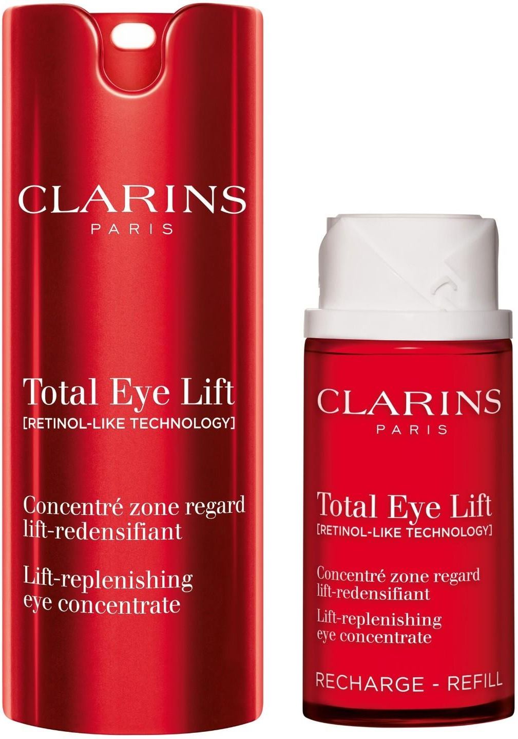 Kompleksowy krem pod oczy z technologią Clarins „LIFT”, opracowany specjalnie z myślą o rewitalizacji okolic oczu. Uzupełnienie. A gdyby tak zyskać moc odmłodzenia okolic oczu w zaledwie kilka sekund? To właśnie obiecuje Total Eye Lift i jego 30-sekundowy efekt liftingu*. Technologiczny przełom z podwójną innowacją w nauce i formule. [RETINOL-LIKE TECHNOLOGY] - Silny organiczny ekstrakt z harongi, o skuteczności zbliżonej do retinolu**, łagodny dla skóry wokół oczu. Opatentowany***, stworzony przez Laboratoria Clarins składnik aktywny zwiększa produkcję kolagenu 12-krotnie.**** W połączeniu z nowym biotechnologicznym ekstraktem z czerwonej janii zapewnia długotrwały efekt liftingu okolic oczu. PRO-TIGHTENING MATRIX - Ten komfortowy, otulający balsam tworzy na skórze warstwę ujędrniającą, zapewniając natychmiastowy efekt liftingu. Skuteczność tekstury została potwierdzona naukowo dzięki nowemu testowi instrumentalnemu Clarins. Dostępne w wersji do ponownego uzupełniania.***** Zachowaj buteleczkę od Total Eye Lift, aby móc ją później ponownie napełnić. *Samoocena 111 kobiet. **Porównawcze badanie kliniczne skuteczności przeciwzmarszczkowej i wygładzającej przeprowadzone na 46 kobietach stosujących przez 56 dni formułę zawierającą organiczny ekstrakt z harongi lub retinol z takim samym % składnikiem jak gotowy produkt. ***Dwa patenty Clarins zarejestrowane we Francji dotyczące skuteczności wyciągu z harongi. **** Badanie in vitro na ekstrakcie z harongi. ***** Refill nie może być stosowany samodzielnie.