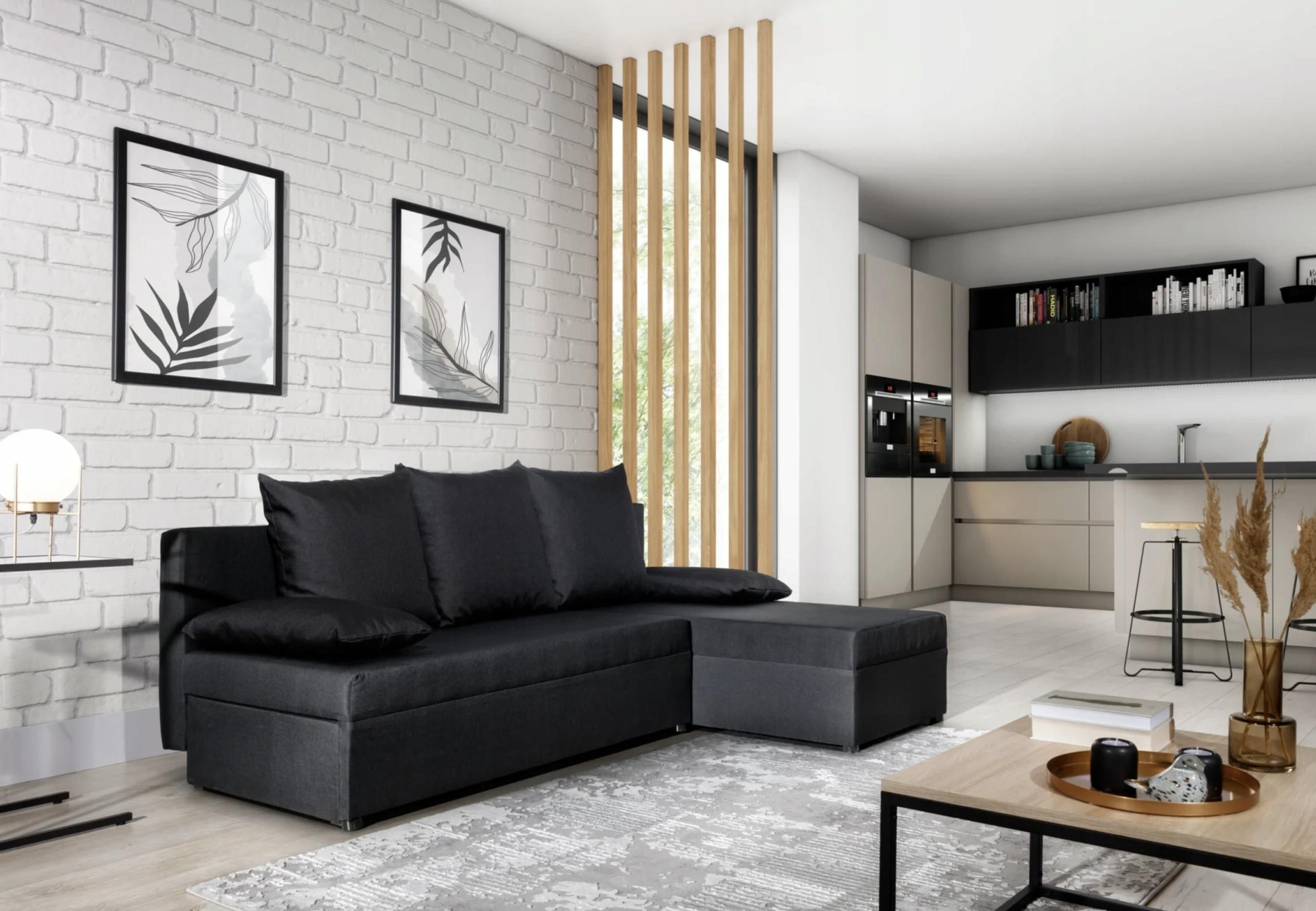 Narożnik GINO Wykonanie tkanina pleciona Sawana 14 czarna Siedzisko i oparcie z pianki T-30 stelaż wykonany z litego drewna + płyta wiórowa funkcja spania pojemnik na pościel narożnik uniwersalny – sam wybierasz stronę podczas montażu poduszki w komplecie mebel wolnostojący (tył i przód z tkaniny) …