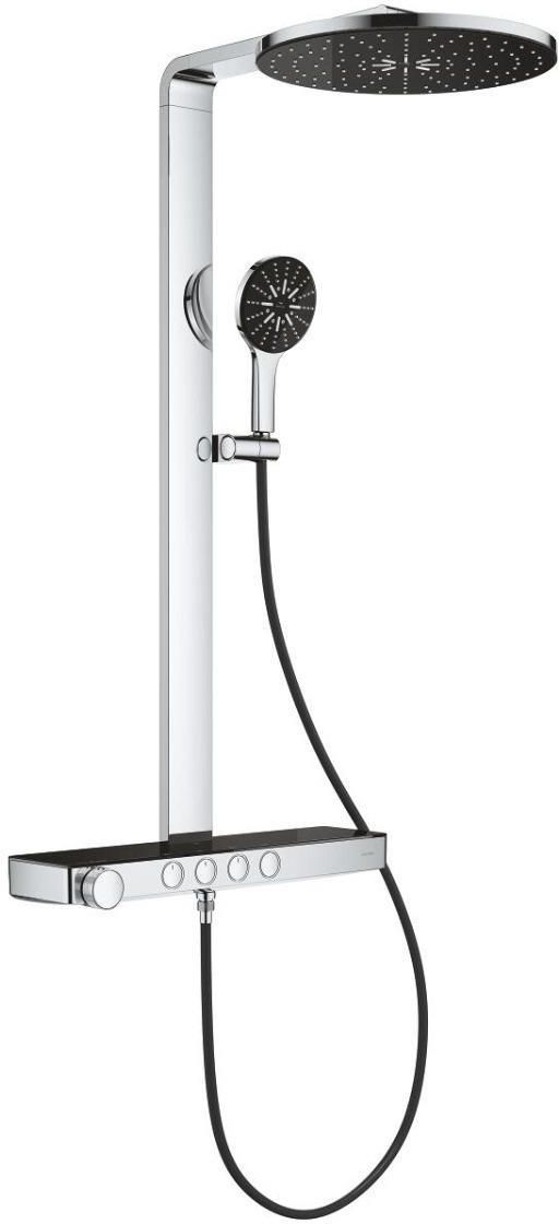 Parametry produktu: Opis produktu: Grohe Spa Rainshower Aqua Pure Zestaw prysznicowy termostatyczny natynkowy z deszczownicą Producent: Grohe Seria: Rainshower Aqua Pure Kod produktu: 101680KI00 Kolor: Czarny / chrom Typ: Termostatyczny / z deszczownicą Montaż: Natynkowy Długość ramienia: 43,5 cm Średnica deszczownicy: 36 cm Długość węża: 175 cm SmartControl bateria termostatyczna natynkowa w metalowej obudowie Przełącznik: Deszczownica / słuchawka prysznicowa Rainshower Aqua Duo: Okrągła deszczownica; akrylowa tarcza natrysku, czarna Kąt obrotu deszczownicy: 0-30° Strumień deszczownicy: GROHE PureRain, ActiveRain Rainshower Aqua 130: Słuchawka prysznicowa (101 676), akrylowa tarcza natrysku, czarna Strumień słuchawki: GROHE Rain, Rain+ i ActiveMassage Regulowany uchwyt słuchawki GROHE Rainshower Aqua Pure: Usuwa chlor i zapach (słuchawka prysznicowa) GROHE SmartTip: Wybór strumienia natrysku przez naciśnięcie pierścienia na słuchawce GROHE EcoJoy: Mniejsze zużycie wody Maksymalne natężenie przepływu (przy 3 barach): 15 l/min GROHE SmartControl: Z metalowymi pokrętłami, uruchamianie / zatrzymanie przepływu poprzez naciśnięcie, regulacja przepływu: od oszczędnego strumienia GROHE Water Saving do pełnego przepływu Full Flow GROHE ProGrip: Metalowy uchwyt z radełkowaną strukturą GROHE TurboStat: Głowica termostatyczna GROHE SafeStop: Blokada na 38°C GROHE SafeStop Plus: W zestawie opcjonalny ogranicznik temperatury 43°C GROHE EasyReach: Zintegrowana półka (czarne szkło) GROHE DreamSpray: Perfekcyjny natrysk GROHE Long-Life: Trwała powłoka SpeedClean: System przeciw osadom wapiennym Wewnętrzny kanał wodny TwistStop: System zapobiegający skręcaniu węża prysznicowego GROHE CoolTouch: Brak ryzyka oparzeń o gorące powierzchnie Przystosowany do podgrzewaczy przepływowych o mocy min 18 kW Minimalny przepływ: 5 l/min Min. rekomendowane ciśnienie: 1,0 bar Wbudowana 6 V bateria litowa typu CR-P2 (42 886 000) Szacowana żywotność baterii: Ok. 10 lat Opcjonalnie: półka Rainshower Aqua (101 677) Rainshower Aqua Pure filtr (101 672 9990) w komplecie EAN: 4067393032427