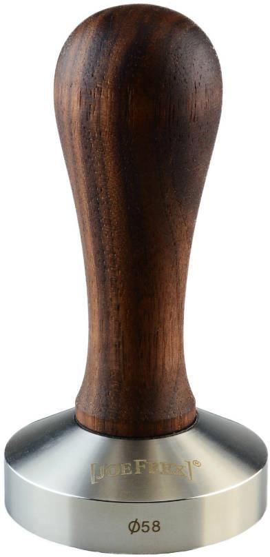 Tamper do kawy o średnicy 58 mm. Podstawowe akcesorium każdego baristy - zarówno profesjonalistów, jak i domowych miłośników espresso. Tamper służy do ubicia i wyrównania powierzchni zmielonej kawy w portafiltrze. Precyzja wykonania podstawy zapewnia równy tamping, dzięki czemu ekstrakcja przebiega równomiernie, co skutkuje znakomitym espresso za każdym razem. Rękojeść została wykonana z ciemnego drzewa orzecha włoskiego. Montowana jest z podstawą za pomocą gwintu. Tamper pasuje do sitek w gastronomicznych i półprofesjonalnych ekspresach do kawy o średnicy grupy 58mm