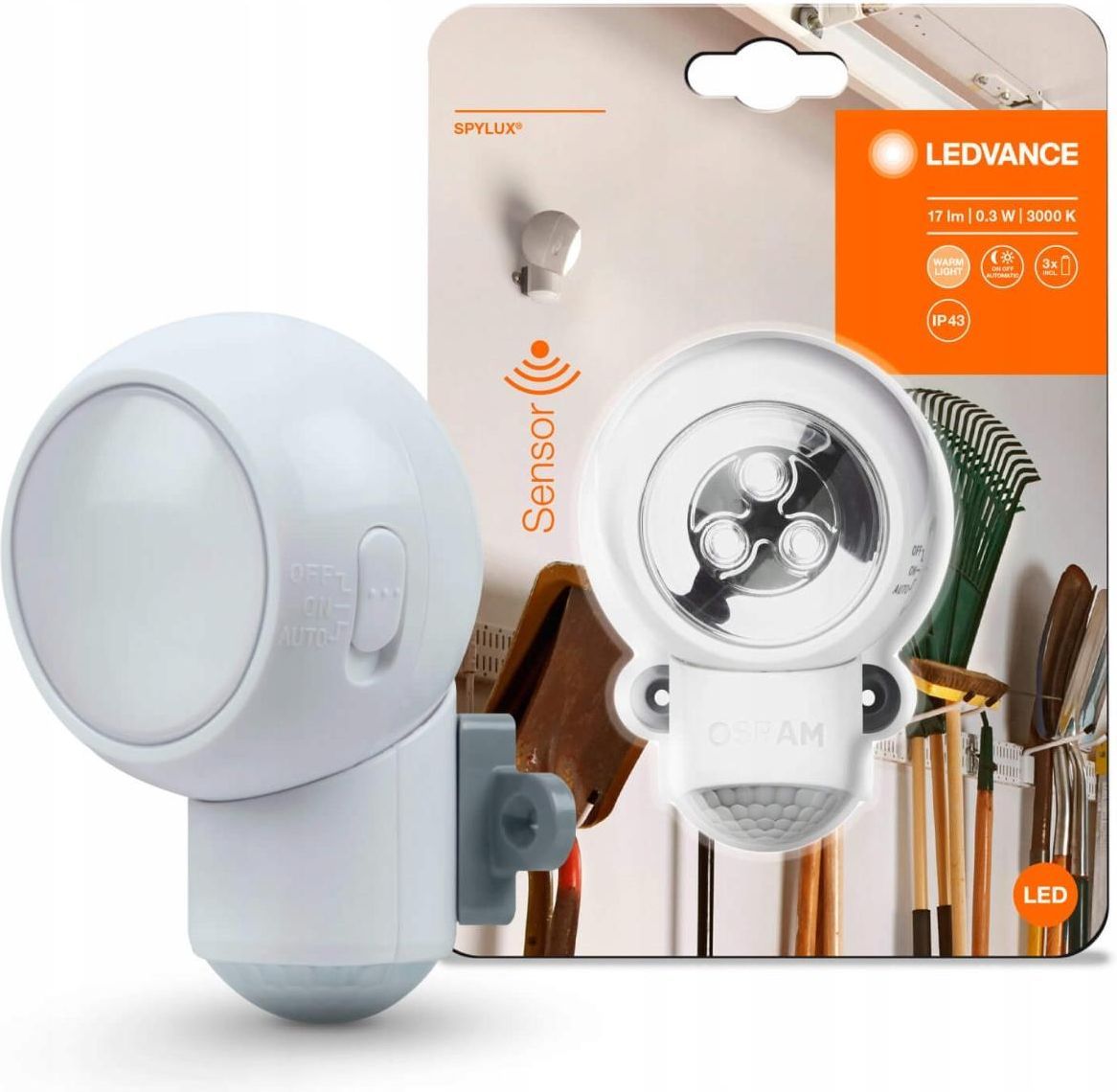 Oświetlenie LED na baterie to wykonana z wysokiej jakości tworzywa sztucznego lampka SPYLUX marki Ledvance, w kolorze białym, która odznacza się ładnym wzornictwem i dużą funkcjonalnością. Przedstawiona przez nas lampka zapewnia nam w ciemności bezpieczeństwo. Produkt spełnia obowiązujące normy europejskie. Lampka zasilana napięciem 4,5 V została wyposażona w energooszczędne źródło światła LED o mocy 0,3W, ciepłej barwie światła o temperaturze barwowej 3000K co pozwala uzyskać strumień świetlny na poziomie 17lm. Lampa pięknie wpasuje się w salonie, sypialni, biurze, jadalni, jak również jako oświetlenie dekoracyjne szafki, półki oraz oświetlenie orientacyjne. Dzięki uchwytowi, który jest zawarty w zestawie, może być mocowany do bardzo wielu powierzchni za pomocą śrub, taśmy samoprzylepnej lub magnesu. Przedstawiona przez nas lampa ma oprawę obrotową. Lampka może mieć zastosowanie latarki, poprzez ściągnięcie lampki z mocowania otrzymujemy przenoście oświetlenie kieszonkowe. CECHY, KTÓRE POSIADA LAMPKA SPYLUX: Klasa ochronności: III Oprawa zasilana baterią, odporna na pył i rozpryski wody (IP43) Oprawa obrotowa, elastyczna eksploatacja Zintegrowany czujnik ruchu Temperatura otoczenia podczas pracy: od -20°C do +30°C KORZYŚCI ZE STOSOWANIA PRODUKTU: Funkcjonalna konstrukcja oraz nowoczesny i atrakcyjny wygląd, Możliwość demontażu z uchwytu i użycia jako latarki DODATKOWE INFORMACJE: Możliwość montażu za pomocą śrub, taśmy samoprzylepnej lub magnesu