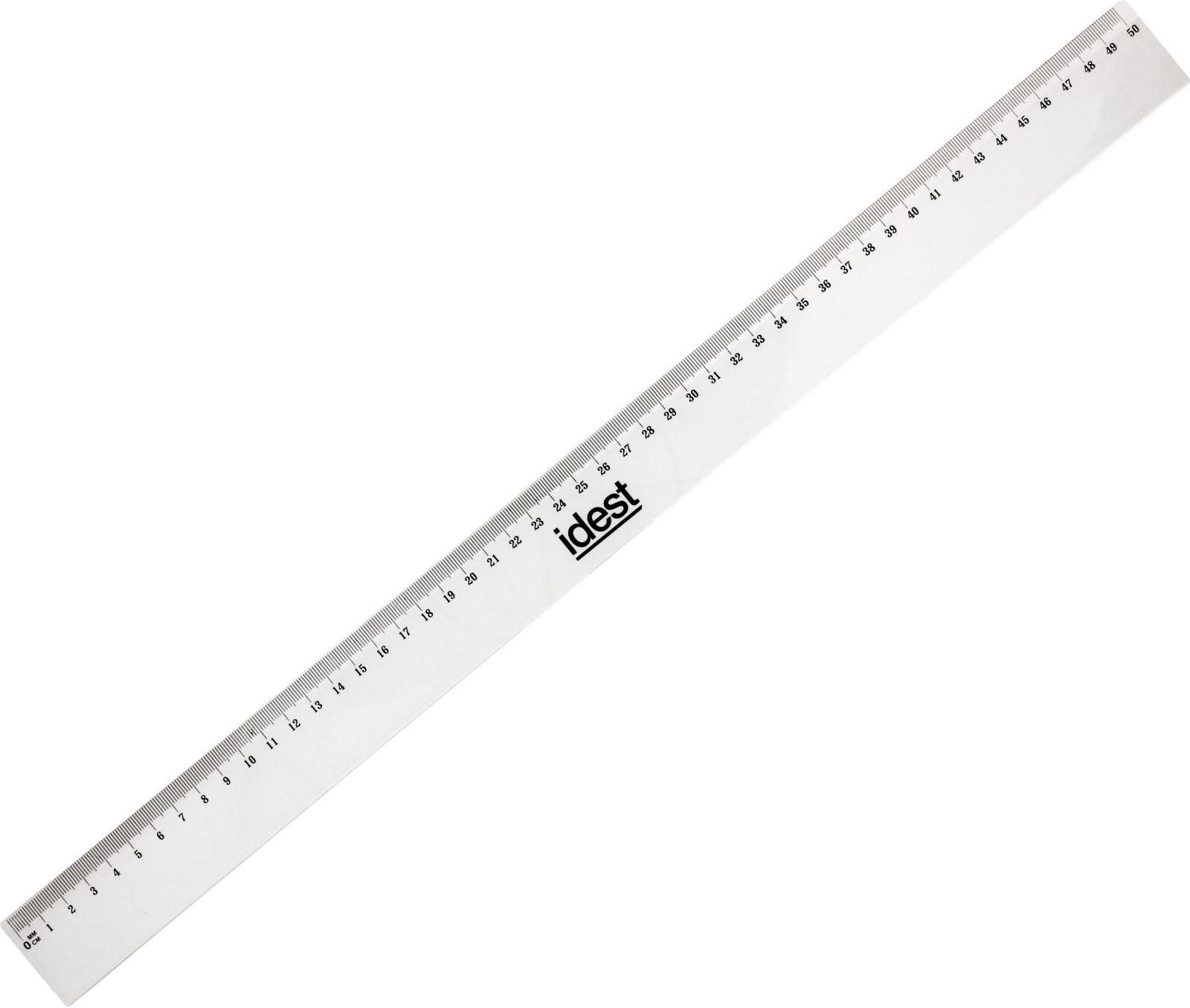 Transparentna linijka marki Idest, wykonana z tworzywa sztucznego z precyzyjnie naniesioną miarką. Długość linijki 50 cm.