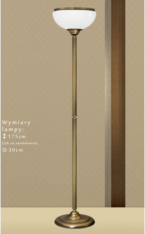 Lampa podłogowa z mosiądzu. - Wykonana w całości z elementów z pełnego mosiądzu. Mosiądz to trwały, szlachetny i ponadczasowy materiał - kliknij, aby dowiedzieć się więcej.- Wykończenie mosiądzu: złota patyna.- Klosz z polskiej huty szkła wykonany ręcznie z wysokiej jakości szkła trójwarstwowego. - Klosz szklany biały połysk z ramką mosiężną (albo klosz biały matowy lub kremowy matowy za dopłatą - zobacz inne lampy z serii R). - Wymiary całkowite: wysokość 175cm (lub na zamówienie), średnica klosza 30cm. - W podstawie lampy umieszczony jest odważnik zapewniający jej stabilność.- Włącznik nożny na przewodzie zasilającym (przewód w kolorze lampy wyprowadzony jest z boku podstawy). - Żródło światła: 1xE27 (żarówka tradycyjna/żarowa o mocy max. 60W) lub żarówka energooszczędna albo LED o większej mocy (np. odpowiednik 100W). Lampa jest fabrycznie nowa, wyprodukowana w Polsce. Gwarancja: 24 miesiące. UWAGA! Lampy podłogowe dla pewności i bezpieczeństwa od lat wysyłamy na minipaletach, jak zawsze za 0zł: SZCZEGÓŁY. Seria R - zobacz wszystkie lampy