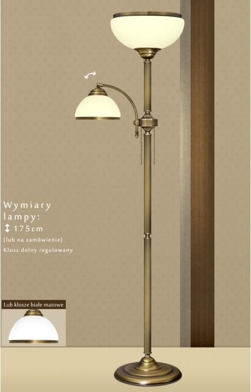 Lampa mosiężna podłogowa z dwoma kloszami. - Wykonana w całości z elementów z pełnego mosiądzu. - Wykończenie: złota patyna. - Klosze szklane kremowe matowe lub białe matowe z ramką mosiężną (albo klosze białe połysk w niżej cenie - zobacz inne lampy z serii R). - Wymiary całkowite: wysokość 175cm (lub na zamówienie), średnica klosza górnego 30cm, dolnego 19cm. - Posiada regulację kąta nachylenia dolnego klosza. - Niezależne włączanie obu źródeł światła (włącznikami łańcuszkowymi umieszczonymi na puszce mosiężnej na wysokości dolnego klosza). Na zamówienie (bez dopłaty) możliwość instalacji włącznika podłogowego na kablu zasilającym.- W podstawie lampy umieszczony jest odważnik zapewniający jej stabilność.- Przewód zasilający (w kolorze lampy) wyprowadzony jest z boku podstawy. - Żródło światła: 2xE27 (żarówki tradycyjne/żarowe o mocy max. 60W) lub żarówki energooszczędne albo LED o większej mocy (np. odpowiednik 100W). Lampa jest fabrycznie nowa, wyprodukowana w Polsce. Gwarancja: 24 miesiące. UWAGA! Lampy podłogowe dla pewności i bezpieczeństwa od lat wysyłamy na minipaletach, jak zawsze za 0zł: SZCZEGÓŁY. Seria R - zobacz wszystkie lampy