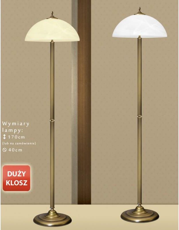 Lampa podłogowa z mosiądzu z dużym kloszem. - Wykonana w całości z elementów z pełnego mosiądzu. - Wykończenie: złota patyna. - Klosz szklany do wyboru: biały ‘alabaster’ lub ecru ‘alabaster’. - Wymiary całkowite: wysokość 170cm (lub na zamówienie), średnica klosza 40cm. - W podstawie lampy umieszczony jest odważnik zapewniający jej stabilność.- Włącznik nożny na przewodzie zasilającym (przewód w kolorze lampy wyprowadzony jest z boku podstawy). - Żródło światła: 3xE27 (żarówki tradycyjne/żarowe o mocy max. 60W) lub żarówki energooszczędne albo LED o większej mocy (np. odpowiednik 100W). Lampa jest fabrycznie nowa, wyprodukowana w Polsce. Gwarancja: 24 miesiące. UWAGA! Lampy podłogowe dla pewności i bezpieczeństwa od lat wysyłamy na minipaletach, jak zawsze za 0zł: SZCZEGÓŁY. Seria B - zobacz wszystkie lampy