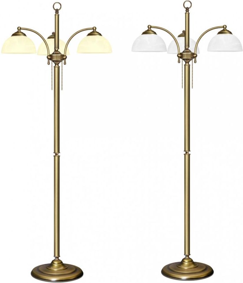 Stylowa mosiężna lampa podłogowa z trzema kloszami. - Wykonana w całości z elementów z pełnego mosiądzu. - Wykończenie: złota patyna. - Klosze szklane do wyboru: biały ‘alabaster’ lub ecru ‘alabaster’ (albo na zamówienie ecru gładki w zależności od dostępności). - Wymiary całkowite: wysokość 170cm …