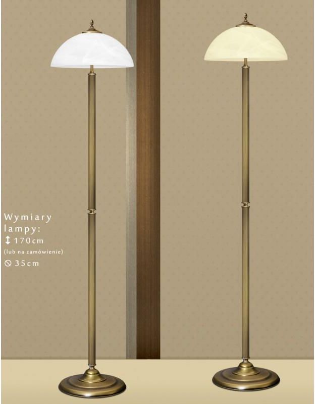 Lampa podłogowa z mosiądzu. - Wykonana w całości z elementów z pełnego mosiądzu. - Wykończenie: złota patyna. - Klosz szklany do wyboru: biały ‘alabaster’ lub ecru ‘alabaster’ (albo na zamówienie ecru gładki w zależności od dostępności). - Wymiary całkowite: wysokość 170cm (lub na zamówienie), średnica klosza 35cm. - W podstawie lampy umieszczony jest odważnik zapewniający jej stabilność.- Włącznik nożny na przewodzie zasilającym (przewód w kolorze lampy wyprowadzony jest z boku podstawy). - Żródło światła: 2xE27 (żarówki tradycyjne/żarowe o mocy max. 60W) lub żarówki energooszczędne albo LED o większej mocy (np. odpowiednik 100W). Lampa jest fabrycznie nowa, wyprodukowana w Polsce. Gwarancja: 24 miesiące. UWAGA! Lampy podłogowe dla pewności i bezpieczeństwa od lat wysyłamy na minipaletach, jak zawsze za 0zł: SZCZEGÓŁY. Seria B - zobacz wszystkie lampy
