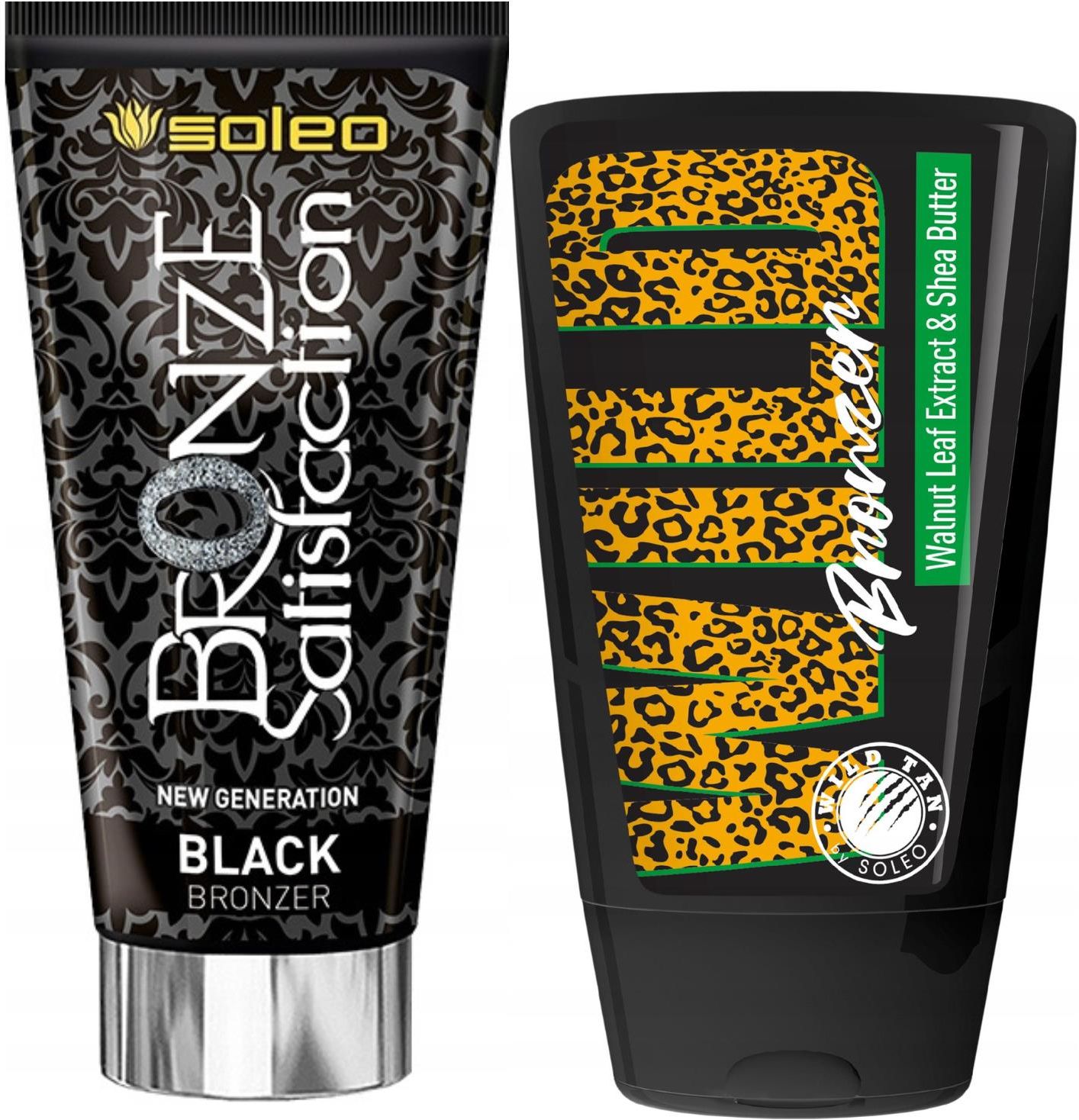 Soleo Black Bronzer Satisfaction + Wild Tan Bronzer GratisSoleo Black Bronzer Satisfaction Do Opalania 150mlStworzony, aby zapewniać ekstremalną satysfakcję! Z szybkiego koloru głębokiej opalenizny. Z przedłużonej trwałości efektu. Z luksusowej, cudownie regenerującej pielęgnacji. Doskonały dla osób już opalonych i opalających się regularnie. Siłą produktu jest mieszanina aż 10 składników wpływających na szybkie pojawienie się upragnionego brązu na skórze. Znajdziesz w nim m.in. DHA, wysoką dawkę erytrulozy, beta-karoten, melaninę, hennę, karmel czy ekstrakt z orzecha włoskiego. Współdziałają one ze sobą tworząc na skórze naturalny, długo utrzymujący się odcień głębokiej opalenizny. To nie wszystko! Produkt przyspiesza także proces naturalnego opalania dzięki tyrozynie i związkom miedzi. Olej macadamia wraz ze związkami nawilżającymi i antyoksydantami, zapewnia doskonałe wygładzenie, regenerację i zabezpiecza skórę przed przyspieszonym starzeniem.Zapach: berry sorbetMega bronzer Soleo Black Bronzer Bronze Satisfaction rekomendowany dla: osób z regularnie i mocno opaloną skóraSposób użycia:Bezpośrednio przed opalaniem nanieś równomierną warstwę na całą powierzchnię ciała. Po aplikacji, umyj dokładnie ręce! Pamiętaj, że produkt przeznaczony jest wyłącznie do użytku zewnętrznego. Aby skutecznie wzmacniać i zachować na opaleniznę dłużej używaj każdorazowo przed wizytą w solarium.Wild Tan Wild Bronzer Z Orzechem Włoskim 125mlBronzer z mieszanką naturalnych bronzerów. Zapewnia piękną opaleniznę, która dłużej utrzymuje się na skórze.Zapach: Hawaii flowerPojemność: 125mlEkstrakt z orzecha włoskiegoJeden z bardziej znanych i szeroko stosowanych naturalnych składników brązujących. Obecny w ekstrakcie juglon, wchodzi w reakcję z keratyną naskórka i tworzy związek barwny, który nadaje skórze brązowy naturalnej opalenizny. Wyróżnia się wysoką stabilnością i brakiem tworzenia smug na skórze oraz mocniejszymi i dłużej utrzymującym się odcieniem brązu od DHA.