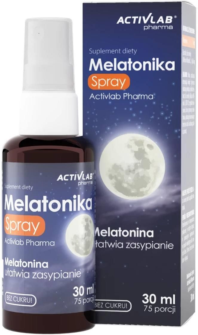 ACTIVLAB Pharma Melatonika Spray 30 ml – wsparcie dla spokojnego snu ACTIVLAB Pharma Melatonika Spray to suplement diety w formie wygodnego sprayu, zawierający melatoninę, która pomaga w skróceniu czasu potrzebnego na zaśnięcie.✅ Jak działa melatonina? Melatonina to naturalny hormon regulujący cykl snu i czuwania. Jej odpowiedni poziom w organizmie sprzyja szybkiemu zasypianiu oraz poprawie jakości snu. Melatonika Spray w formie aplikacji podjęzykowej zapewnia szybkie wchłanianie, dzięki czemu efekt działania jest odczuwalny w krótkim czasie. Melatonina pomaga również w łagodzeniu subiektywnego odczucia zespołu nagłej zmiany strefy czasowej. Korzystne działanie występuje w przypadku spożycia conajmniej 0,5 mg melatoniny krótko przed pójściem spać pierwszego dnia podroży i przez kolejne kilka dni po przybyciu do celu podróży. ACTIVLAB Pharma Melatonika Spray – korzyści Skraca czas zasypiania – idealne rozwiązanie dla osób borykających się z bezsennością. Wygodna forma sprayu – łatwa i szybka aplikacja bez konieczności połykania tabletek. Szybkie wchłanianie – aplikacja podjęzykowa wspiera efektywność działania melatoniny. Idealny dla osób podróżujących – pomaga regulować rytm dobowy i minimalizować skutki zmiany stref czasowych. Z naturalnym aromatem – przyjemny smak ułatwia stosowanie. Jak stosować ACTIVLAB Pharma Melatonika Spray? ⭐️Zalecana dzienna porcja: 4 psiknięcia (1 porcja) na około 30 minut przed snem. ⭐️ Melatonina 1 mg ⭐️1porcja = 4 psiknięcia za pomocą atomizera około 30 min przed snem. ⭐️Spray należy aplikować pod język dla maksymalnej skuteczności. ⭐️Przed użyciem należy wstrząsnąć – ewentualny osad to naturalne zjawisko. Składniki Woda Substancja utrzymująca wilgoć: gliceryna Substancja słodząca: ksylitol Regulator kwasowości: kwas cytrynowy Melatonina Substancje konserwujące: benzoesan sodu, sorbinian potasu Aromat Ważne informacje Produkt przeznaczony wyłącznie dla dorosłych. Nie stosować w ciąży ani w okresie karmienia piersią. Osoby cierpiące na choroby przewlekłe powinny skonsultować stosowanie z lekarzem. Nie przekraczać zalecanej dziennej porcji do spożycia. Suplement diety nie zastępuje zróżnicowanej diety i zdrowego trybu życia. Przechowywać w suchym i chłodnym miejscu, poza zasięgiem dzieci.