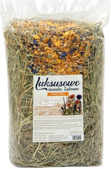 TIVO sianko luksusowe kwiatowe 650g Sianko luksusowe to sianko łąkowe najwyższej jakości, wytworzone w tradycyjny i naturalny sposób, Sianko zbierane jest z wysokiej klasy naturalnych łąk. Trawy dobieramy tak, aby zawierały grube i cienkie źdźbła. Po skoszeniu sianko jest suszone na słońcu, leży na łące w letnie bezdeszczowe dni, dzięki czemu zachowuje delikatnie zielony kolor oraz łąkowy aromat. W każdej z paczek znajdziesz 600g sianka oraz ok 50g kwiatów nagietka i chabra bławatka :) Duża zawartość włókna wzmacnia układ trawienny, a zróżnicowana grubość traw poprawia ściernie ząbków. Pamietaj, że Twój pupil musi mieć stały dostęp do sianka oraz wody.