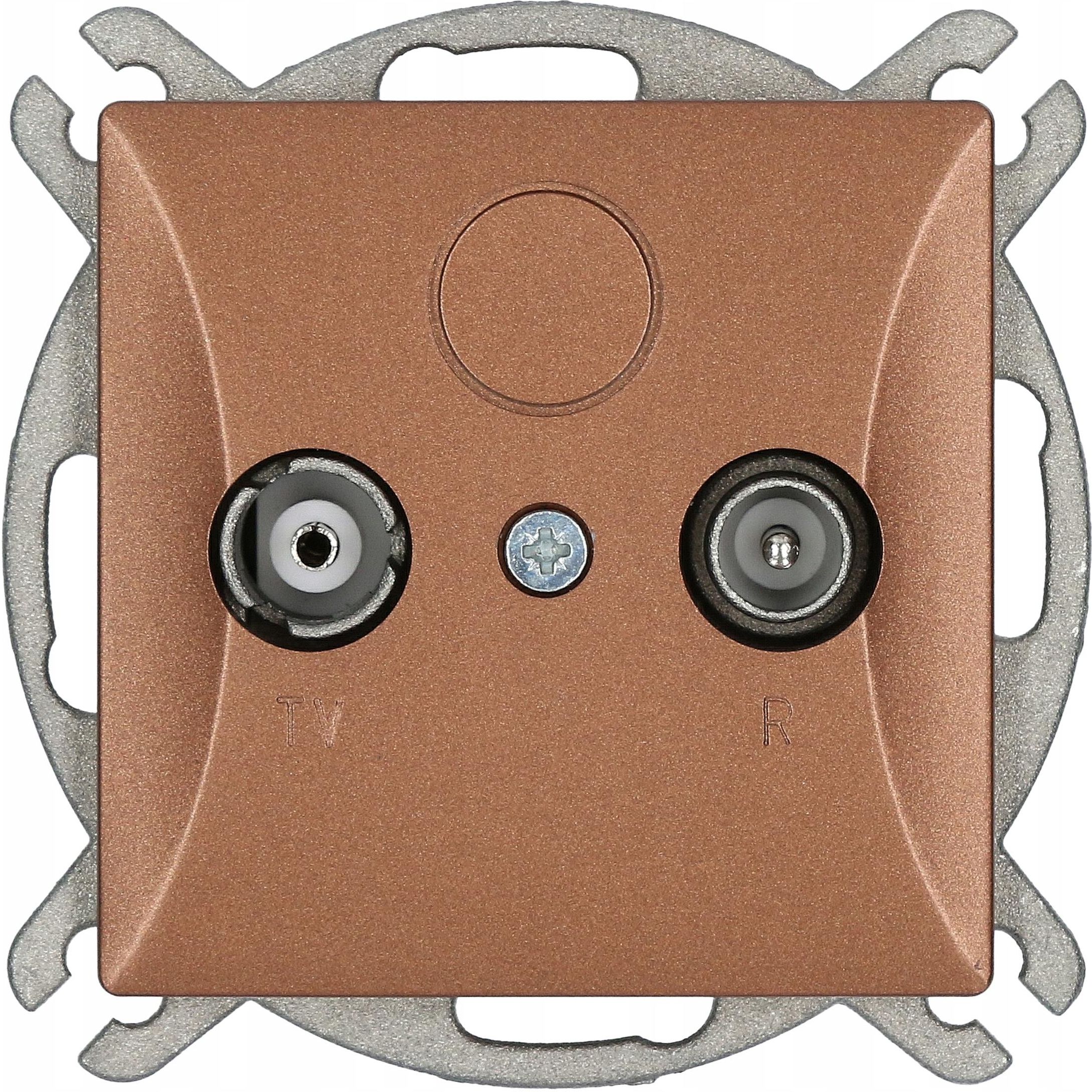 Gniazdo antenowe RTV końcowe serii OPAL w kolorze miedzianym. Model: GAP/K Op Moduł miedź Moduł gniazda bez ramki. Parametry gniazda: Montaż przewodów: zaciski śrubowe Montaż gniazda: puszka podtynkowa Ø60 Rodzaj materiału: tworzywo ABS Seria modułowa, można montować w ramkach wielokrotnych dostępnych na naszych aukcjach. Pasuje tylko do ramek serii Opal. Stopień ochrony w oferowanym gnieździe to IP20. Produkt polskiej produkcji. Spełnia europejskie normy CE, posiada certyfikaty oraz świadectwa zgodności. Producentem produktu jest firma Timex-Elektro.