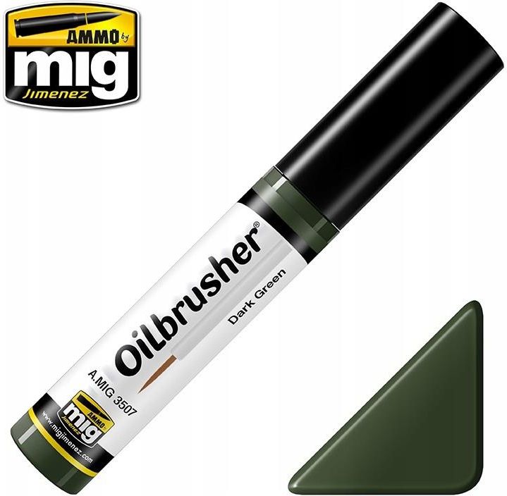 Ammo by Mig: Oilbrusher - Dark Green (10 ml) Ammo: Oilbrusher to wysokiej jakości farba olejna zamknięta w wygodnym pojemniku wyposażonym w precyzyjny pędzelek. Praktyczne opakowanie z aplikatorem pozwala na nakładanie farby bezpośrednio na figurkę lub makietę, bez konieczności wyciskania produktu z tubki na paletkę, czy karton. Dzięki temu farba jest dłużej świeża i nie wysycha, dzięki czemu marnuje się mniej produktu. Dodatkowo, nowoczesny pojemnik zawiera system dozująco-czyszczący, który usuwa nadmiar farby z pędzla, pozostawiając na końcówce odpowiednią ilość.