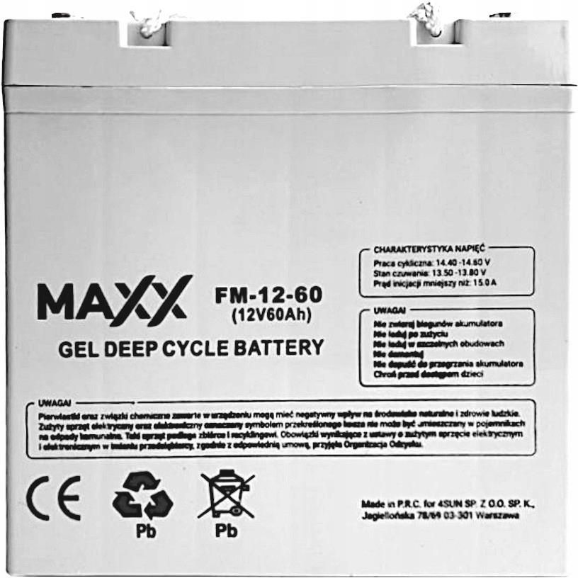 AKUMULATOR ŻELOWY DEEP CYCLE MAXX 60AH 12V Produkcja 2022 Akumulatory są wykonane w technologii VRLA i głównie przeznaczone m.in.: do zastosowania w systemach zasilania awaryjnego (UPS, systemy automatyki), instalacjach solarnych oraz z przetwornicami napięcia. Najlepiej sprawdzają się w układach ładowania buforowego, jednak mogą być też stosowane w aplikacjach, w których akumulatory pracują cyklicznie. Charakteryzują się wysoką odpornością na głębokie rozładowania. Dla głębokości rozładowania do 50 % posiadają około 650 cykli pracy. Świetnie absorbują gazy. Projektowana żywotność wynosi 8-10 lat dla 20-25°C. Nie wymagają uzupełniania lub wymiany elektrolitu Mogą pracować w dowolnej pozycji Charakteryzują się wysoką sprawnością i wydajnością Wysoka odporność na uszkodzenia mechaniczne i wysokie temperatury Bezpieczne w użytkowaniu - akumulator szczelnie zamknięty (VRLA) bez możliwości wycieku Akumulatory żelowe charakteryzują się budową wewnętrzną opartą na separatorach wykonanych z włókna szklanego w, których skupiony jest elektrolit. Separatory umieszczone są pomiędzy ołowianymi płytkami wewnątrz zasobnika energii w akumulatorze. Dodatkową cechą akumulatorów tego typu jest posiadanie automatycznego systemu uszczelniania (zawory ciśnieniowe - Valve Regulated). Zawory otwierają się w momencie wykrycia zbyt wysokiego ciśnienia wewnątrz akumulatora, powodując bezpieczne odprowadzenie powstałego gazu na zewnątrz obudowy, zapobiegając uszkodzeniu. Do takiej sytuacji najczęściej dochodzi w momencie przeładowywania akumulatora. Obudowa akumulatora wykonana jest z materiału typu ABS, a ogniwa z miedzi. AKUMULATOR TYPU DEEP CYCLE - Akumulator Deep Cycle został zaprojektowany i skonstruowany w taki sposób, aby mógł ulegać głębokiemu rozładowaniu, zanim zacznie proces ponownego ładowania. W przeciwieństwie do niego standardowe akumulatory rozruchowe konstruowane są z myślą o dostarczaniu krótkotrwałych dawek energii umożliwiających na rozruch silnika. Płyty w akumulatorach typu Deep Cycle posiadają gęstszy materiał aktywny aniżeli płyty w zwykłych akumulatorach samochodowych, dzięki czemu są wytrzymalsze na obciążenia powodowane głębokimi cyklami bez utraty masy aktywnej lub pojemności. ZASTOSOWANIE Układy zasilania awaryjnego (zasilacze UPS, przetwornice) Systemy alarmowe, p.poż Instalacje fotowoltaiczne Systemy kontroli dostępu Zasilanie kas i drukarek fiskalnych Systemy telewizji przemysłowej Zasilanie zabawek elektrycznych Systemy telekomunikacyjne Systemu oświetlenia zapasowego Zasilanie wyposażenia medycznego Zasilanie pojazdów elektrycznych (motocykle, quady, skutery, kosiarki, łódki, motorówki itp.) Zasilanie urządzeń mobilnych (wózki inwalidzkie, golfowe, wózki widłowe, maszyny czyszczące)