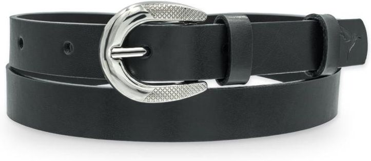 Czarny, skórzany pasek damski ze srebrną, półokrągłą klamrą