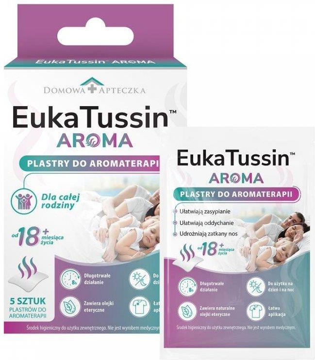 Opis EukaTussin AROMA to innowacyjne plastry aromaterapeutyczne, które dzięki naturalnym olejkom eterycznym wspierają codzienny komfort oddychania. Plastry przeznaczone są do stosowania na ubranie – uwalniają aromat przez wiele godzin, przynosząc uczucie świeżości i ulgi zarówno w ciągu dnia, jak i w nocy. Składniki Składnik aktywny: Mięta polna (Mentha arvensis), Lawenda Grosso (Lavandula hybrida), Rozmaryn lekarski (Rosmarinus officinalis), Lawenda wąskolistna (Lavandula angustifolia), Sosna zwyczajna (Pinus sylvestris) Składniki pomocnicze: linalol, limonen, geraniol, kumarynę. Charakterystyka wspomaganie aromaterapii i poprawa komfortu oddychania udrożnienie dróg oddechowych przy katarze i przeziębieniu relaksacja i redukcja napięcia dzięki zapachom lawendy i rozmarynu odczuwalne odświeżenie i ulga w uczuciu zmęczenia Stosowanie przed użyciem zdjąć folię ochronną przykleić plaster na ubranie w odległości ok. 30 cm od twarzy stosować 1 plaster na dobę; przy długotrwałym użyciu wymieniać co 24 h nie aplikować bezpośrednio na skórę ani na wilgotne powierzchnie Przeciwwskazania nadwrażliwość na którykolwiek składnik plastry aromaterapeutyczne bezpośredni kontakt plastra ze skórą lub błonami śluzowymi stosowanie u dzieci poniżej 18. miesiąca życia bez konsultacji z lekarzem Ostrzeżenia i środki ostrożności unikać kontaktu z oczami; w razie dostania się plastra do oka przemyć wodą nie używać w pobliżu ognia i źródeł ciepła przechowywać w oryginalnym opakowaniu, w temperaturze poniżej 25 °C chronić przed wilgocią i bezpośrednim nasłonecznieniem przechowywać poza zasięgiem dzieci Działania niepożądane Stosowanie zgodnie z zaleceniami jest zwykle dobrze tolerowane. Rzadko mogą wystąpić: reakcje alergiczne (wysypka, świąd) drażnienie skóry w miejscu kontaktu (jeśli plaster przyklei się do wilgotnej tkaniny) Przechowywanie w suchym miejscu, temperatura 5–25 °C w oryginalnym, szczelnym opakowaniu używać do daty ważności podanej na opakowaniu Producent Domowa Apteczka Sp. z o.o.