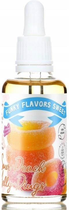 Funky Flavors Sweet Sour Peach Jelly Rings - słodkie kropelki smakowe bez cukru i kalorii Słodzony aromat spożywczy w dużej butelce 50ml z precyzyjnym zakraplaczem. Funky Flavors to skoncentrowane, bezcukrowe, beztłuszczowe aromaty spożywcze idealne do odżywek białkowych, domowych batonów …