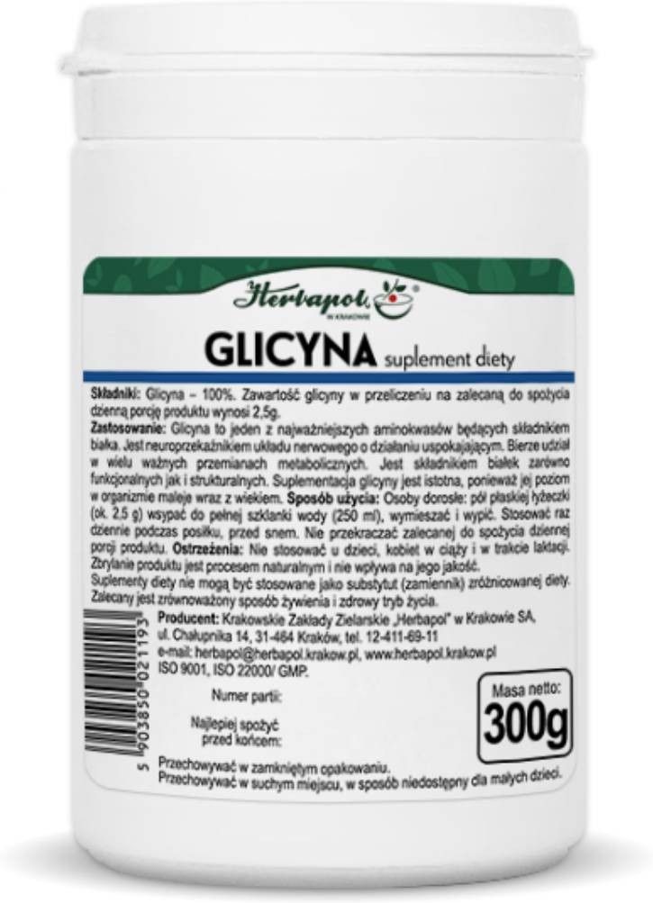 Składniki: Glicyna – 100%. Masa netto: 300 g Właściwości: Budulec białek: Jako podstawowy składnik białek strukturalnych, jest niezbędna do budowy tkanek. Wsparcie syntezy kolagenu: Aż 1/3 aminokwasów tworzących kolagen to właśnie glicyna. Bez niej regeneracja skóry, stawów i ścięgien jest utrudniona. Równowaga układu nerwowego: Działa jako neuroprzekaźnik hamujący, co sprzyja wyciszeniu organizmu, szczególnie w okresie intensywnego stresu lub przed snem. Zalecane dzienne spożycie: Osoby dorosłe: pół płaskiej łyżeczki (ok. 2,5 g) wsypać do pełnej szklanki wody (250 ml) wymieszać i wypić. Stosować raz dziennie podczas posiłku, przed snem. Przeciwwskazania: Nadwrażliwość na którykolwiek ze składników preparatu. W okresie ciąży i karmienia piersią przed zastosowaniem należy skonsultować się z lekarzem lub farmaceutą. Przechowywanie: Przechowywać w zamkniętym opakowaniu, w sposób niedostępny dla małych dzieci. Producent: Herbapol w Krakowie SA ul. Chałupnika 14 31-464 Kraków