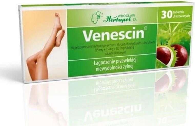 . Venescin 30 drażetki Venescin wskazany jest do stosowania celem złagodzenia objawów przewlekłej niewydolności żylnej.Preparat przeznaczony dla osób dorosłych.  Venescin  to preparat złożony, który zawiera w swym składzie wyciąg z nasion kasztanowca, rutynę (rutozyd) i eskulinę. Eskulina i rutyna to związki chemiczne, które naturalnie występują w roślinach. Obie te substancje, jak i składniki wyciągu z kasztanowca (w tym escyna) działają ochronnie na naczynia krwionośne. Obniżają przepuszczalność ścian naczyń włosowatych, wzmacniają je i wykazują działanie przeciwobrzękowe. Dzięki nim poprawia się stan napięcia ścian naczyń żylnych i przepływ krwi. Działają też przeciwzapalnie. Rutyna posiada właściwości antyoksydacyjne. Jak większość flawonoidów uszczelnia naczynia i działa przeciwwysiękowo. Przeciwdziała także powstawaniu niektórych wysoce reaktywnych wolnych rodników. Sprawia również, że utlenianie witaminy C przebiega wolniej tym samym przedłużając jej działanie. Wykazuje też działanie przeciwzapalne. Eskulina działa podobnie do witaminy P - uszczelnia naczynia krwionośne, szczególnie najcieńsze włosowate naczynia krwionośne. Z uwagi na to zmniejsza lub zatrzymuje krwawienia. Sprawia też, że drobne naczynia krwionośne są bardziej elastyczne. Dawkowanie: Preparat przeznaczony do stosowania doustnego. Należy przyjmować 1-2 drażetki 3 razy dziennie przed posiłkiem. Skład: Substancje czynne: Hippocastani seminis extractum siccum, Rutosidum, Aesculinum Substancje pomocnicze: skrobia ziemniaczana, magnezu stearynian, kalafonia, olej rycynowy, guma arabska, talk, sacharoza, indygotyna, żółcień chinolinowa ***Preparatu nie należy stosować u dzieci. Venescin  jest niezalecany w przypadku uczulenia na substancje czynne lub którykolwiek z pozostałych składników tego leku. Nie należy go stosować w I trymestrze ciąży. Przed użyciem zapoznaj się z ulotką, która zawiera wskazania, przeciwwskazania, dane dotyczące działań niepożądanych i dawkowanie oraz informacje dotyczące stosowania produktu leczniczego, bądź skonsultuj się z lekarzem lub farmaceutą, gdyż każdy lek niewłaściwie stosowany zagraża Twojemu życiu lub zdrowiu.