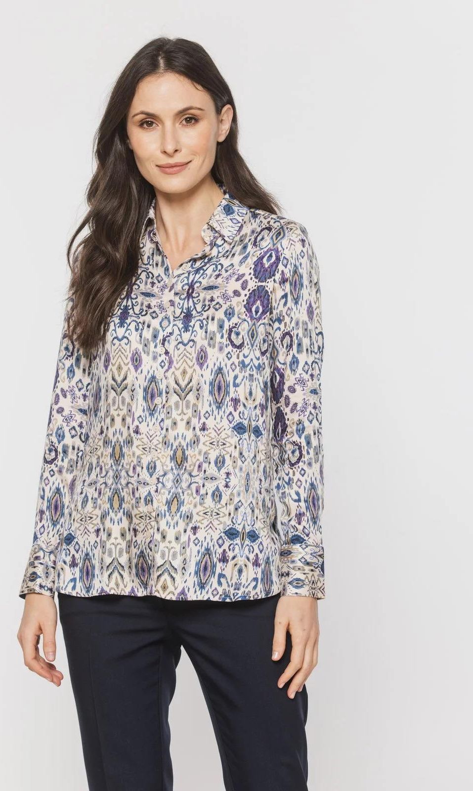 Beżowa koszula damska o prostym kroju w granatowe i fioletowe wzorki, klasyczny, miękki kołnierzyk, 100% wiskoza
