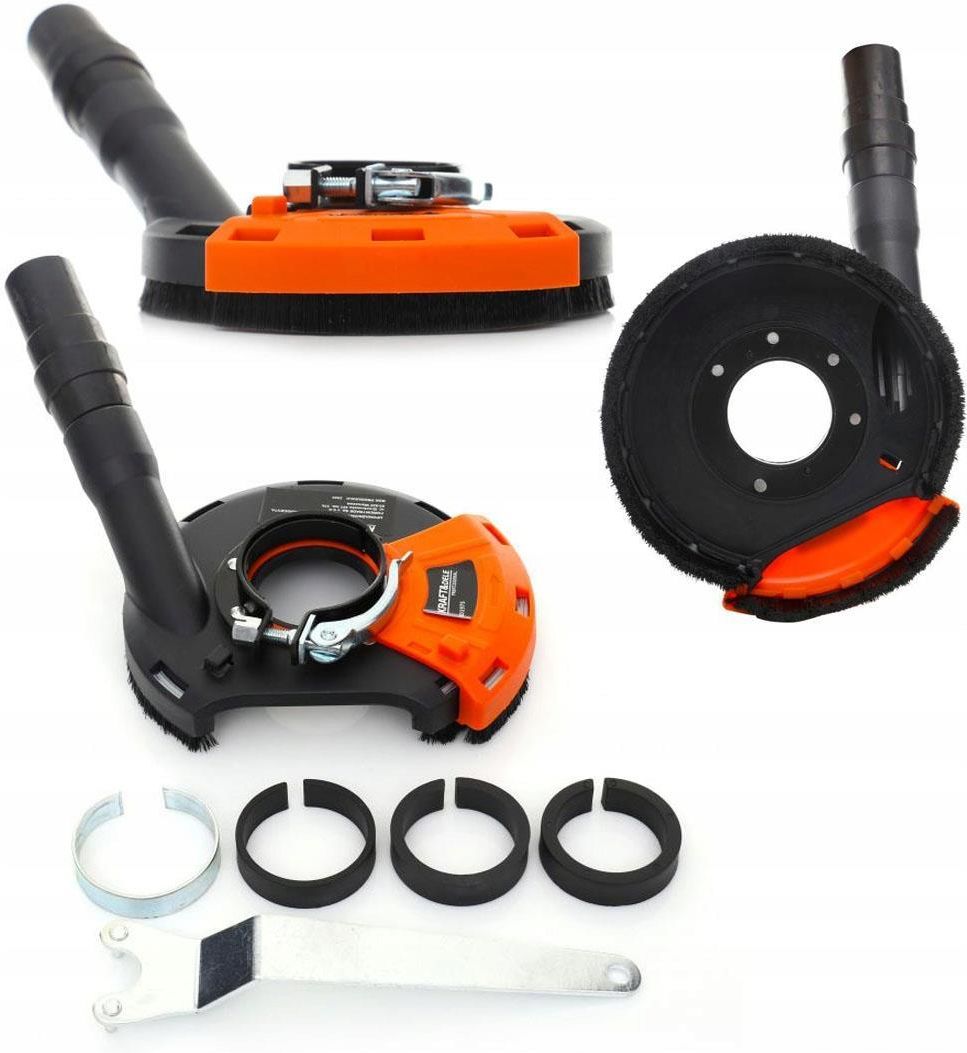OSŁONA PRZECIWPYŁOWA ODSYSAJĄCA DO SZLIFIERKI KĄTOWEJ 180mm Model: KD1976 Producent: KRAFT&DELE Osłona przeciwpyłowa z wieńcem szczotkowym marki KRAFT&DELE to niezwykle przydatny element wyposażenia podczas prac budowlanych, remontowych czy stolarskich. Pozwala na skuteczne odsysanie szkodliwego dla zdrowia i tworzącego bałagan w miejscu pracy, pyłu. JEDEN PRODUKT, WIELE ZALET Pokrywa ochronna dla dodatkowego zabezpieczenia podczas szlifowania. Adapter/osłona umożliwia skuteczne odsysanie szkodliwego pyłu podczas szlifowania powierzchni płaskich. Mocuje się go do kołnierza wrzeciona w miejsce standardowej osłony metalowej. Szczelne i solidne łączenia osłony ze szlifierką sprawiają, że podczas pracy wszystko jest stabilne, a pył w 100% jest odciągany. Montaż oraz obsługa jest prosta i szybka. Dzięki zastosowaniu redukcji mocujących pasuje do większości szlifierek 180 mm. SZEROKIE ZASTOSOWANIE Osłona jest znakomitym rozwiązaniem w: Budownictwie Usługach remontowych Warsztatach stolarskich Lakierniczych ZESTAW ZAWIERA: Osłonę Gumową redukcję na wąż 6 redukcji na szlifierkę Klucz do tarczy DANE TECHNICZNE: Przeznaczenie: szlifierki kątowe Średnice tarcz: 180 mm Ilość redukcji: 6 szt.