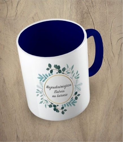 Kubeczek w listki dla babci na prezent. Z boku kubka nadrukowany jest tekst "Najcudowniejsza babcia na świecie".