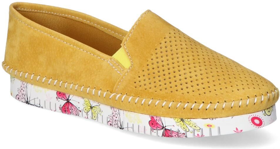 Wygodne półbuty znanej marki Lanqier: - cholewka wykonana została ze skóry naturalnej zamszowej - wnętrze zostało pokryte skórą naturalną i materiałem tekstylnym aby zapewnić komfort podczas użytkowania - wkładka wewnętrzna wykonana została ze skóry naturalnej aby zapewnić wygodę - podeszwa o grubości 2 cm zapewnia stabilizację - gumy ściągające ułatwiają zakładanie i dopasowanie obuwia - żółty kolor oraz modny fason zadowolą każdą kobietę!