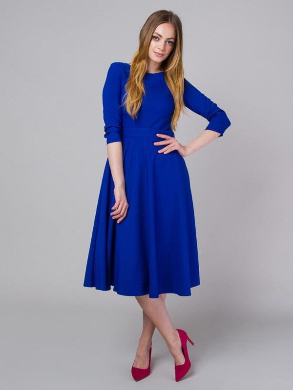 Modrakowa rozkloszowana sukienka MIDI z rękawami 3/4