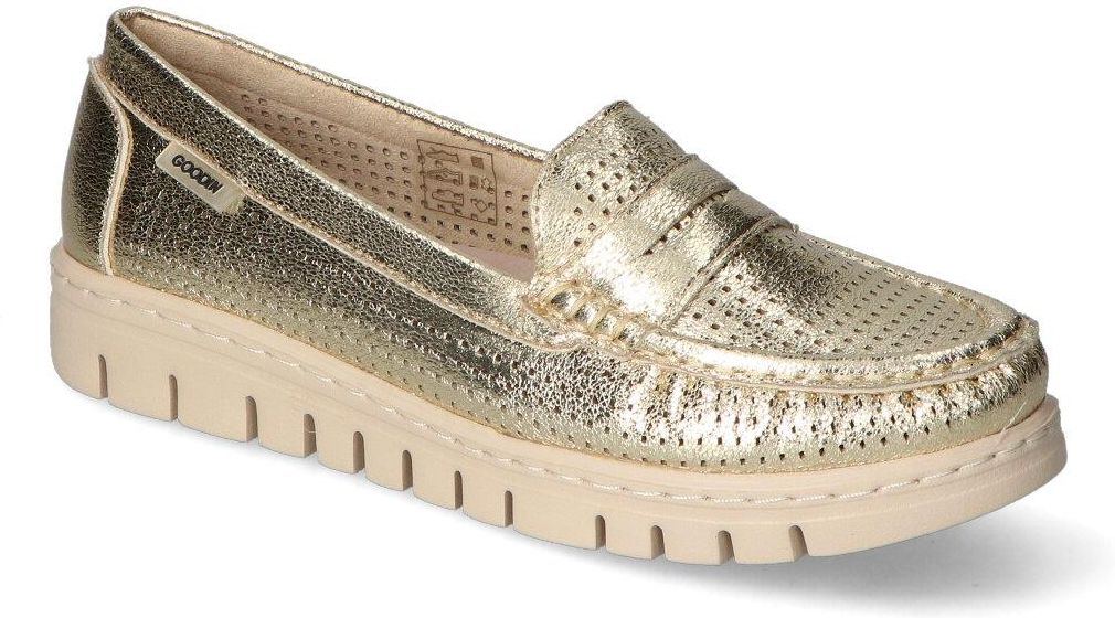 Modne mokasyny: - cholewka wykonana została ze skóry ekologicznej - wnętrze zostało pokryte materiałem tekstylnym aby zapewnić komfort podczas użytkowania - wkładka wewnętrzna została wykonana ze skóry naturalnej - podeszwa o grubości 3 cm zapewnia odpowiednią stabilizacje - złoty kolor oraz modny fason tworzą zachwycający efekt!