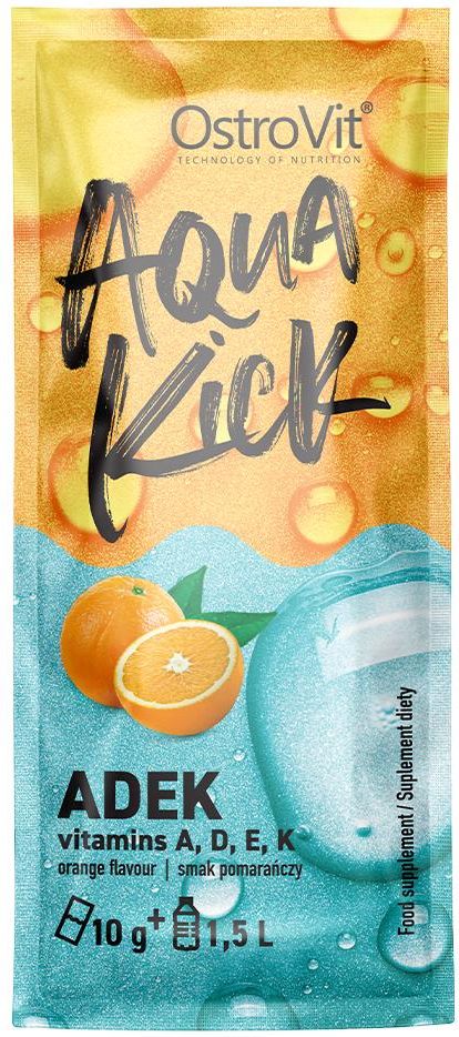 OstroVit Aqua Kick ADEK 10 gOstroVit Aqua Kick ADEK to nowoczesny suplement diety w formie saszetki, dzięki któremu dostarczysz do swojego organizmu niezbędną dzienną dawkę witamin rozpuszczalnych w tłuszczach. Kompleks ADEK, czyli nic innego jak witaminy A, D, E i K, zapewniają szerokie spektrum działania, a ich niedobory mogą być odczuwalne w całym organizmie. Jeżeli poszukujesz wygodnego w stosowaniu suplementu diety, z którym kompleksowo zadbasz o swoje zdrowie, koniecznie wypróbuj nasze saszetki z serii Aqua Kick. Dlaczego warto spożywać OstroVit Aqua Kick ADEK?Suplement diety OstroVit Aqua Kick ADEK zawiera kompleks witamin rozpuszczalnych w tłuszczach, które są niezbędne dla prawidłowego funkcjonowania organizmu. Ich niedobory, a w szczególności niedobór witaminy D, to powszechny problem, z którym zmierzyć musi się wiele osób. Obniżona odporność, wypryski, niespodziewane skurcze czy nieprawidłowości w krzepnięciu krwi to tylko niektóre z przykładów dolegliwości spowodowanych niedoborem ADEK. Jeżeli chcesz kompleksowo wesprzeć swój organizm, dołącz do swojej codziennej diety suplement z kompleksem ADEK. Postaw na nasze saszetki z serii Aqua Kick, jeżeli chcesz: wesprzeć układ odpornościowy zyskać zdrową i promienistą skórę mieć zdrowe kości i zęby zachować prawidłowe widzenie chronić organizm przed procesami starzenia Właściwości:Odpowiednia suplementacja witamin A, D, E oraz K może być dla wielu osób kłopotliwa. Połykanie kilku tabletek naraz, i to najlepiej podczas spożywania wysokotłuszczowego posiłku, jest nie tylko nieprzyjemne, ale również - kłopotliwe, w szczególności gdy jesteś w ciągłym ruchu. Aby sprostać potrzebom osób aktywnych, opracowaliśmy specjalne, rozpuszczalne w wodzie saszetki, które możesz spożywać przez cały dzień. Najważniejsze cechy suplementu: ZESTAW 4 WITAMIN - Saszetki Aqua Kick zawierają aż cztery różne witaminy. Dzięki temu jeden suplement może zastąpić kilka preparatów. SZEROKIE DZIAŁANIE - Przy regularnym spożyciu OstroVit Aqua Kick ADEK zapewni Ci zwiększenie odporności, lepszy stan skóry oraz włosów, a także wzmocnienie kości. WYGODNA FORMUŁA - Po prostu wymieszaj zawartość saszetki z butelką wody i popijaj tak przygotowany napój, gdy tylko masz na to ochotę. PRZYJEMNY SMAK - Dzięki rozpuszczeniu w wodzie zawartości saszetki uzyskasz napój o przyjemnym pomarańczowym smaku. Jest to wspaniałe rozwiązanie dla osób, które nie przepadają za czystą wodą. Składniki aktywne suplementu OstroVit Aqua Kick ADEKSaszetki OstroVit Aqua Kick ADEK zawierają w swoim składzie cztery rozpuszczalne witaminy, z których każda pełni określone role w organizmie: WITAMINA A - Pozwala zachować zdrową skórę, a także wzmacnia i przyspiesza wzrost paznokci. Zwiększa odporność organizmu oraz zapewnia prawidłowe widzenie. WITAMINA D - Wspiera układ odpornościowy w walce z chorobami. Poprawia przyswajanie wapnia, dzięki czemu wpływa na stan kości oraz zębów. WITAMINA E - Chroni komórki organizmu przed stresem oksydacyjnym. Wspiera widzenie, a także ochrania czerwone krwinki. WITAMINA K - Zapewnia lepszą krzepliwość krwi, dzięki czemu rany szybciej się goją. Poprawia przyswajanie witaminy D. Sposób użycia:Wymieszać zawartość saszetki w 1,5 l wody. Spożywać w ciągu całego dnia. Produkt przeznaczony dla osób dorosłych. Przed zastosowaniem wskazane jest wykonanie badania 25-(OH)D we krwi oraz konsultacja wyniku badania z lekarzem lub farmaceutą. Nie przekraczać zalecanej dziennej porcji do spożycia. Suplement diety nie może być stosowany jako substytut (zamiennik) zróżnicowanej diety. Zalecany jest zrównoważony sposób żywienia i zdrowy tryb życia. Nie spożywać w przypadku uczulenia na którykolwiek ze składników produktu. Produkt nie powinien być stosowany przez dzieci, kobiety w ciąży oraz matki karmiące. Przechowywać w sposób niedostępny dla małych dzieci. SkładnikiRegulator kwasowości: kwas cytrynowy; maltodekstryna, aromat, koncentrat soku z buraka w proszku, regulator kwasowości: kwas jabłkowy; substancje słodzące: sukraloza, acesulfam K; barwnik: karoteny; octan DL-alfa-tokoferylu (witamina E), cholekalcyferol (witamina D), substancja przeciwzbrylająca: dwutlenek krzemu; octan retinylu (witamina A), menachinon-7 MK-7 (witamina K) pochodzący z Bacillus subtilis natto (soja). Produkt może zawierać mleko (łącznie z laktozą), orzeszki ziemne, inne orzechy, nasiona sezamu, owies, jaja, skorupiaki, ryby. Wartość odżywczaMasa netto produktu: 10 g Ilość porcji w opakowaniu: 1 Wielkość porcji: 1 saszetka Wartość odżywcza 10 g proszku % RWS* 100 ml roztworu Wartość energetyczna 42 kJ / 10 kcal - 3 kJ / 1 kcal Tłuszcz 0 g - 0 g - w tym kwasy tłuszczowe nasycone 0 g - 0 g Węglowodany 2.5 g - 0.2 g - w tym cukry 0.5 g - 0 g Białko 0 g - 0 g Sól 0 g - 0 g Składniki aktywne 10 g proszku % RWS* 100 ml roztworu Witamina A 800 µg 100 52.98 µg Witamina D 50 µg / 2000 IU 1000 3.31 µg Witamina E 12 mg 100 0.79 mg Witamina K 75 µg 100 4.97 µg *RWS- Referencyjna wartość spożycia