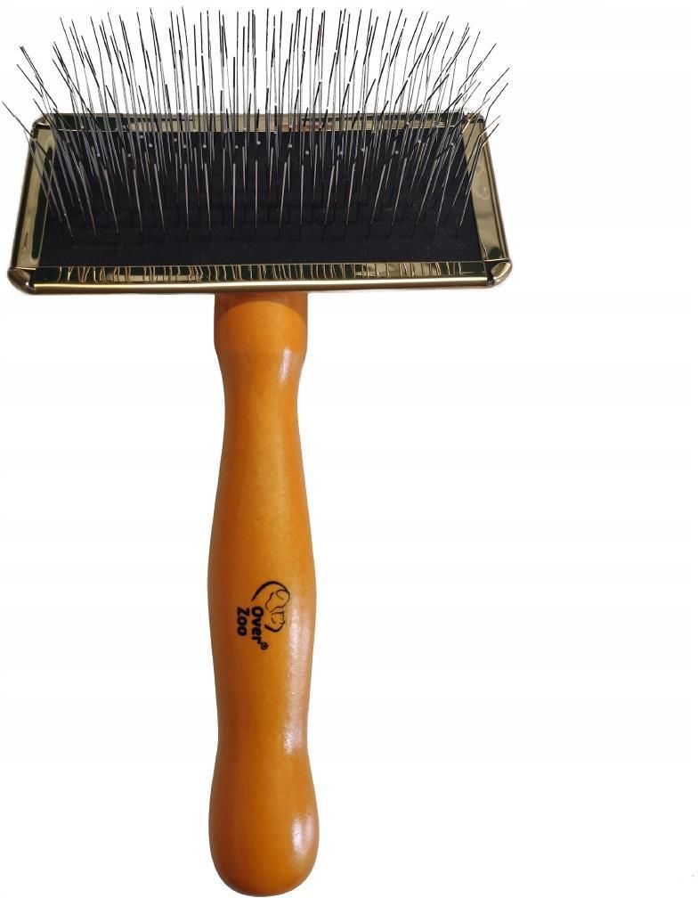 Over Zoo Szczotka z Długimi Igłami Rozmiar M Dzięki długim stalowym, lekko wygiętym igłom doskonale sprawdza się do rozczesywania splątanej sierści, kołtunów oraz wyczesywania martwego podszerstka. Gumowa poduszka amortyzuje nacisk dzięki czemu szczotka lepiej rozczesuje włos i nie podrażnia skóry zwierzęcia. Ergonomiczny, drewniany uchwyt ułatwia rozczesywanie. Główne zalety produktu: Igły ze stali nierdzewnej Gumowa poduszka Drewniany uchwyt o ergonomicznym kształcie