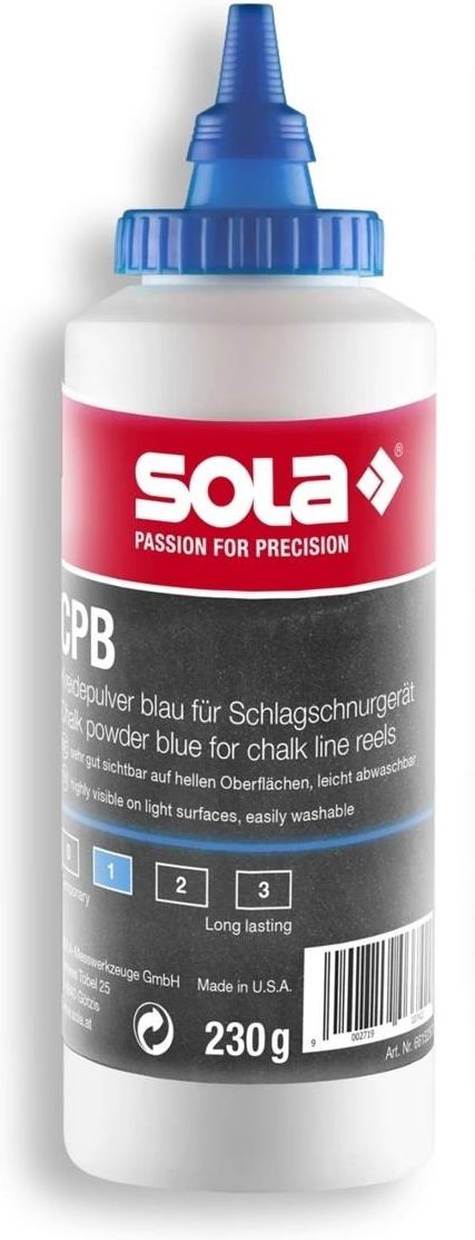 PROSZEK TRASERSKI KREDOWY SOLA CLKS 30M NIEBIESKI 230g Specyfikacja techniczna: opis przedmiotu: kreda w proszku materiał: puder kredowy z kolorowymi pigmentami kolor: niebieski Opis produktu: wyraźnie widoczne linie na jasnych powierzchniach drobne szlifowanie w celu uzyskania wysokiej jakości koloru łatwy do zmywania kreda w proszku jest drobno mielona dzięki temu przylega optymalnie do sznurka każdą linię można narysować wyraźnie i dokładnie duża ilość pigmentu barwiącego i niewielka zawartość zawartość kredy zapewniają dobrą widzialność odporna na działanie deszczu i wiatru