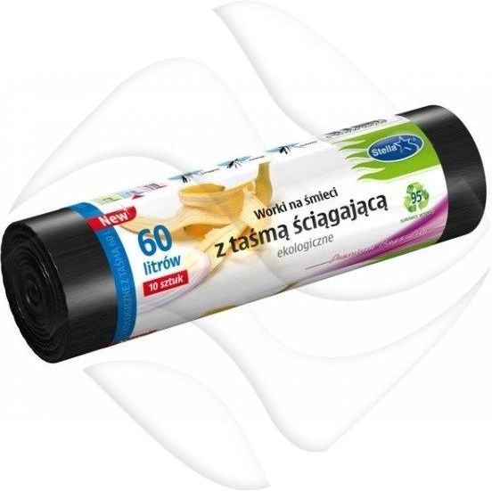 Worki na śmieci ekologiczne 60L 10szt. z taśmą (LDPE) STELLA WNS-4256 ST Worki na śmieci _ekologiczne z taśmą ściągającą__ surowiec uzyty do ich produkcji w 95% pochodzi _z odpadów foliowych przetworzonych w procesie recyklingu__ wykonane z grubej folii LDPE, _ odporne na rozerwanie__ posiadają tzw. prosty zgrzew dna, dzieki któremu zwiekszona _jest uzyteczna pojemnośc worka (po rozlozeniu).__ sluzą do pakowania odpadów sanitarnych i śmieci__ wytrzymale na obciązenia