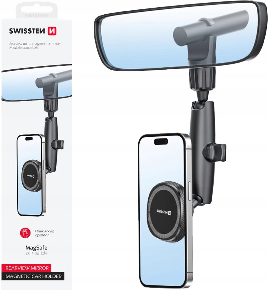 SWISSTEN Uchwyt na lusterko ładowarka QI MagSafe Magnetyczny uchwyt samochodowy montowany na lusterko zgodny z technologią Magsafe Uchwyt magnetyczny na lusterko to akcesorium, które jest niezbędne w każdym samochodzie. Dzięki technologii Magsafe smartfony iPhone 13 i nowsze są idealnie przymocowane do uchwytu. W przypadku innych smartfonów (również innych marek) w zestawie znajduje się samoprzylepny pierścień, który przykleja się do tylnej części smartfona lub etui. Montaż na lusterku wstecznym Uniwersalny - dzięki mechanizmowi mocującemu uchwyt można przymocować do lusterka o średnicy rurki 4,12-36,3 mm. Pasuje do większości modeli lusterek wstecznych Obsługa uchwytu jedną ręką Uniwersalny - dzięki mechanizmowi mocującemu uchwyt można przymocować do lusterka o średnicy rurki 4,12-36,3 mm.