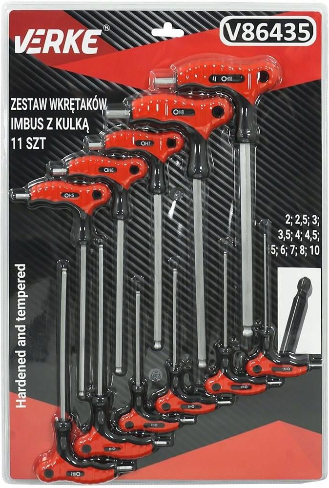 ZASTAW WKRĘTAKÓW IMBUSOWYCH Z UCHWYTEM T I KULKĄ 11 SZT VERKE Zestaw wkrętaków sześciokątnych imbus został wykonany z wysokiej jakości materiałów. Imbusy posiadają kuliste końcówki na długim boku, ułatwiające pracę klucza pod kątem. Rączka została wykonana z tworzywa sztucznego pokrytego gumową powłoką, co zapewnia pewny chwyt w dłoni. W zestawie 2.0*100mm 2.5*100mm 3.0*100mm 3.5*100mm 4.0*150mm 4.5*150mm 5.0*150mm 6.0*150mm 7.0*155mm 8.0*190mm 10.0*195mm Zestaw wkrętaków, imbusy z kulką, uchwyt 11-el., wkrętaki HEX Zestaw śrubokrętów sześciokątnych marki VERKE został wykonany z wysokiej jakości materiałów. Imbusy posiadają kuliste końcówki, ułatwiające pracę klucza pod kątem. Rączka została wykonana z tworzywa sztucznego pokrytego gumową powłoką, co zapewnia pewny chwyt w dłoni. Materiał wykonania: stal Cr-V (chromowo - wanadowa) Wkrętaki zostały wykonane z wysokiej jakości stali chromowo-wanadowej (Cr-V), która charakteryzuje się wyjątkową trwałością, odpornością na ścieranie oraz korozję. Dzięki zawartości chromu stal zyskuje większą odporność na utlenianie i działanie czynników chemicznych, natomiast wanad poprawia elastyczność i wytrzymałość mechaniczną narzędzia. Materiał ten jest często wykorzystywany w profesjonalnych narzędziach ręcznych, ponieważ zapewnia długą żywotność i niezawodność nawet przy intensywnym użytkowaniu. Wybór stali Cr-V świadczy o solidnym wykonaniu zestawu oraz jego przeznaczeniu do prac zarówno amatorskich, jak i profesjonalnych. Zalety Kuliste końcówki robocze – ułatwiają pracę w trudno dostępnych miejscach, umożliwiają wkręcanie i wykręcanie śrub pod kątem Wysoka jakość wykonania – stal CrV zapewnia dużą odporność na odkształcenia, pęknięcia i korozję Ergonomiczny uchwyt T – gwarantuje lepszą kontrolę nad momentem obrotowym oraz zmniejsza zmęczenie dłoni przy długotrwałej pracy Antypoślizgowa rękojeść – pokrycie gumowe zwiększa komfort i bezpieczeństwo użytkowania Kompletny zestaw rozmiarów – szeroki zakres wymiarów imbusów pozwala na dopasowanie narzędzia do wielu zadań technicznych Praktyczne opakowanie – zestaw dostarczany w poręcznej kasecie, ułatwiającej przechowywanie i organizację narzędzi Zastosowanie Zestaw wkrętaków imbusowych VERKE z uchwytem typu T to narzędzia przeznaczone do precyzyjnych i wymagających prac technicznych. Znakomicie sprawdzą się zarówno w profesjonalnych warsztatach, jak i w użytku domowym. Idealne do zastosowań w: serwisach rowerowych i motocyklowych pracach przy maszynach, pojazdach i urządzeniach przemysłowych montażu mebli i konstrukcji technicznych hobbystycznych pracach modelarskich i mechanicznych miejscach, gdzie konieczna jest praca pod kątem lub w ograniczonej przestrzeni