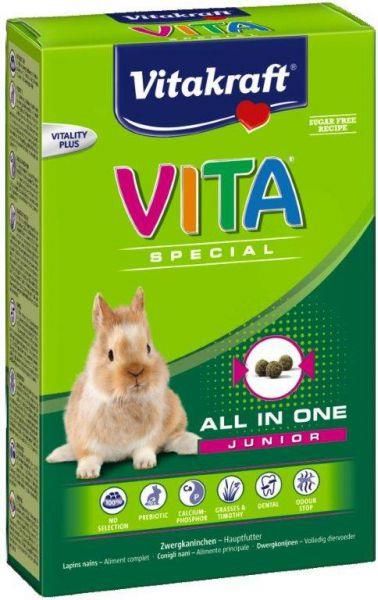 VITA SPECIAL FOR KIDS- karma pełnoporcjowa dla królików miniaturowych do 6 miesiąca życia. Każda granulka karmy zawiera wszystkie niezbędne witaminy, minerały, błonnik oraz białka. W ten sposób chronimy zwierzę przed selektywnym zjadaniem podawanego mu pożywienia, które może spowodować awitaminozę.Vita Special dostarcza zwierzętom optymalnych składników niezbędnych im w zależności od gatunku oraz etapu życia i rozwoju.Vita Special to kompletna karma o wysokiej zawartości błonnika wspomagająca właściwe trawienie oraz ścieranie się przednich zębów. Poza zrównoważoną proporcją wapna i fosforu karma zawiera także inne niezbędne składniki pokarmowe- ważne dla rozwoju kości i zębów. Rozmiar karmy jest odpowiedni dla młodych osobników i dostosowany do ich małych zębów. Karma zawiera specjalną kombinację aktywnych składników znacznie redukującą nieprzyjemne zapachy. Receptura opracowana przez weterynarzy. Skład: zboża (1.0% kiełki pszeniczne), produkty pochodzenia roślinnego, warzywa, minerały, oleje i tłuszcze, ekstrakt z rośliny Yucca Shidigera. Składniki analityczne: białko surowe 15.4%, włókno surowe 11.7%, wapń 0.8%, fosfor 0.6% Dodatki/kg: witamina A 7472 j.m., witamina D3 897 j.m., witamina E 44.8 mg, miedź jako pięciowodny siarczan miedzi (II) 12.0 mg. Opakowanie: 600g.