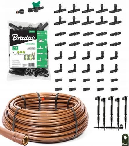Zestaw do nawadniania z wężem kroplującym SOLID z kompensacją ciśnienia 100m Skład zestawu: ✅ wąż kroplujący z kompensacją ciśnienia 100m - 1 sztuka ✅ przyłącze na kran GW 1/2" - 1 sztuka ✅ zawór GZ 1/2", wtyk na wąż 16mm - 1 sztuka ✅ trójnik, 3x wtyk na wąż 16mm - 10 sztuk ✅ łącznik, wtyk na wąż 16mm - 10 sztuk ✅ kolanko, wtyk na wąż 16mm - 10 sztuk ✅ zaślepka, wtyk na wąż 16mm - 10 sztuk ✅ szpilka z uchwytem na wąż 16mm, długość 16cm - 100 sztuk Cechy produktu: zestaw zawiera wąż kroplujący i 142 elementów pozwalających swobodne ułożyć wąż kroplowniki rozmieszczone są co 33cm kroplowniki posiadają unikalny labirynt i zapewniają niewielki spadek przepływu wody wraz ze wzrostem długości węża wydajność jednego kroplownika to 2,3 l/h przy ciśnieniu 1 bar ciśnienie robocze od 0,5 do 4,5 bar umożliwia nawadnianie dużych obszarów, co w efekcie powiększa uzyskane plony pozwala obniżyć koszty nawadniania upraw możliwe podłączenie zestawu do zasilania wody poprzez standardowe szybkozłącze możliwe łączenie elementów w dowolny sposób idealny do upraw kwiatowych i owocowych Dane techniczne linii kroplującej : Długość: 100 mb Rozstaw emiterów: 33 cm Średnica zewnętrzna: 16 mm Grubość ścianki: 1,1 mm Kolor: brązowy Ciśnienia pracy: 0,5-4,5 bar Ciśnienie maksymalne: 4,5 bar Wydajność kroplownika: 2,1 l/h Kompensacja ciśnienia: TAK Linia posiada kompensację ciśnienia co zwiększa jej sprawność - na całej długości linii kroplowanie jest jednakowe. Kompensacja ciśnienia zapobiega sytuacji w której na końcach linii emitery zbyt słabo kroplują. Rura Solid charakteryzują się długą żywotnością oraz łatwością montażu i prostą obsługą. Dystrybucja wody odbywa się za pośrednictwem cylindrycznych emiterów wyposażonych w filtr na wlocie i samoczyszczącego się turbu-lentnego labiryntu. Emitery wciskane są w odpowiednich odstępach w rurę, a następnie całość jest zgrzewana. Tak powstała linia kroplująca nie posiada żadnych wystających części, ani żadnych dodatkowych złączy wpływających na straty ciśnienia. Jest bardzo wytrzymała na ścieranie oraz uszkodzenia mechaniczne i można ją stosować wielosezonowo. Wyjątkowo elastyczna rura umożliwia szybki i łatwy montaż. Unikalny materiał o znacznie większej elastyczności pozwala na ciaśniejsze zaginanie rur przy zastosowaniu mniejszej liczby kolanek, co ułatwia instalację.