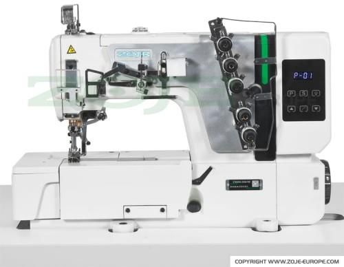 ZOJE C5000-G-364-02 SET to 3-igłowy, 5-nitkowy interlok z płaskim łożem, wyposażony w transport dolny różnicowy i automatyczne pozycjonowanie igieł. Wyposażony w kompletny przyrząd do lamowania. Maszyna znana też jako kapówka albo renderka.Przemysłowy interlok z lamownikiem z nowej serii …