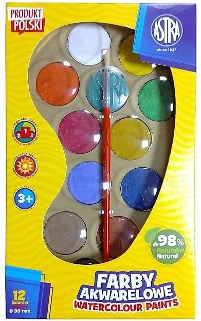 Farby akwarelowe ASTRA to doskonały wybór dla każdego, kto ceni sobie funkcjonalność i wszechstronność. Dzięki zastosowaniu bazy wodnej i spoiwa organicznego, farby są bezpieczne i nadają się do malowania na różnych powierzchniach, takich jak papier, tektura, glina, utrwalona modelina, drewno oraz różnego rodzaju tynki. Ich łatwość aplikacji sprawia, że świetnie sprawdzają się zarówno wśród dzieci, jak i dorosłych. Równomierne rozprowadzanie farby po podłożu ułatwia tworzenie płynnych przejść kolorystycznych, cieniowania i mieszania barw. To doskonały wybór dla dzieci w wieku przedszkolnym i wczesnoszkolnym, które dopiero zaczynają swoją przygodę z malarstwem akwarelowym. Cechy produktu: Bezpieczna formuła - na bazie wody i spoiwa organicznego Do różnych powierzchni - papier, tektura, glina, modelina, drewno, tynki Łatwe w użyciu - równomierne rozprowadzanie farby na podłożu Idealne dla dzieci i początkujących - proste w aplikacji Możliwość mieszania barw, wykonywania przejść i cieniowania - wszechstronne zastosowanie 12 intensywnych kolorów - szeroka paleta do kreatywnych projektów Wygodne opakowanie kartonowe - łatwe przechowywanie i transport
