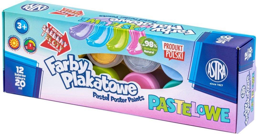 Farby plakatowe pastelowe Astra 12 kolorów ASTRA art-pap ✅ ✔️ Farby plakatowe do malowania na papierze, kartonie, drewnie, nieglazurowanej ceramice i kamieniu. Wodorozcieńczalne farby kryjące są niezwykle wydajne i cechują się soczystymi i niezwykle intensywnymi barwami. Składają się w 98% z …